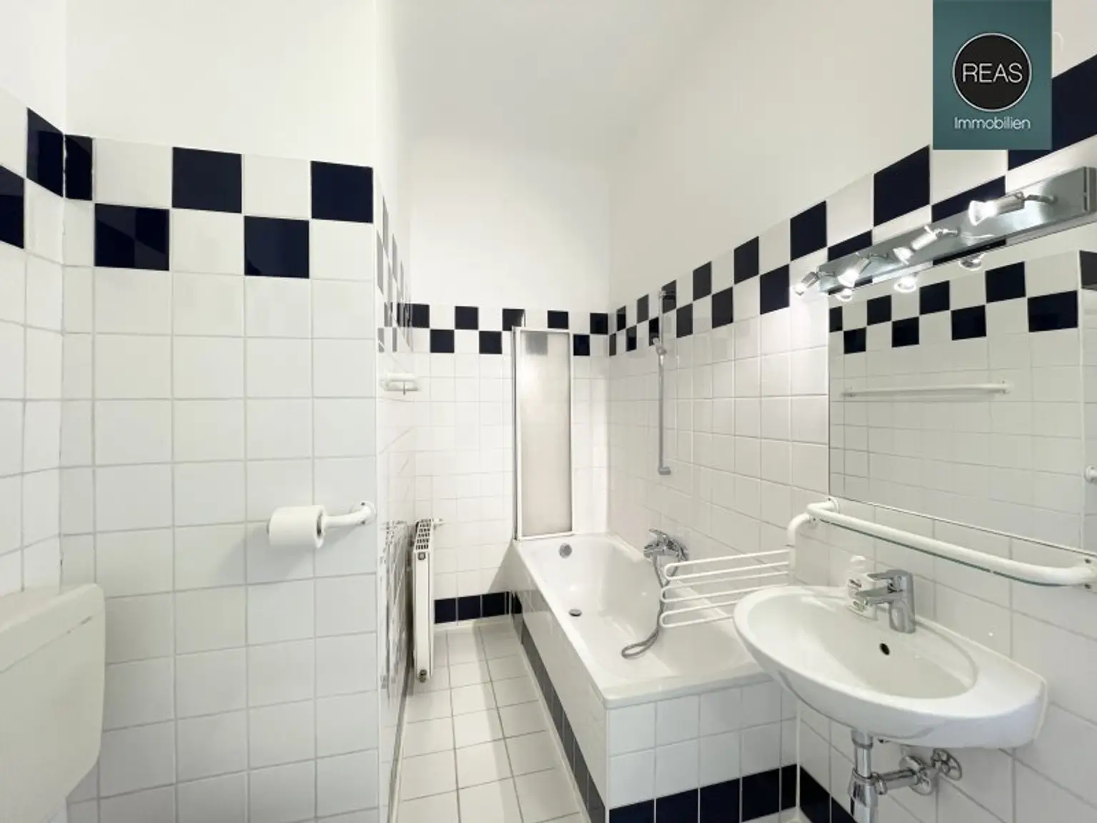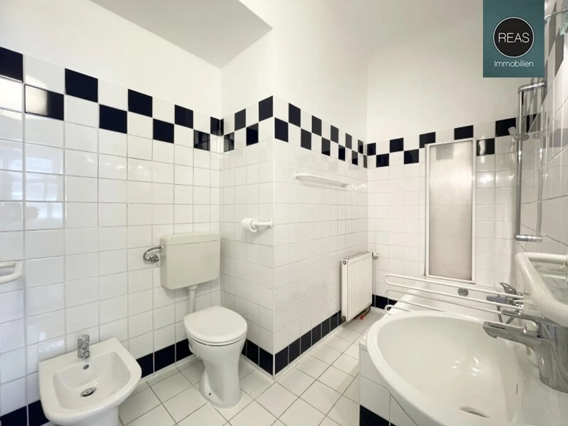 * 1 Badezimmer inkl. WC, Bidet, Badewanne mit Duschwand, Waschbecken samt Spiegel und Beleuchtung, Waschmaschinenanschluss