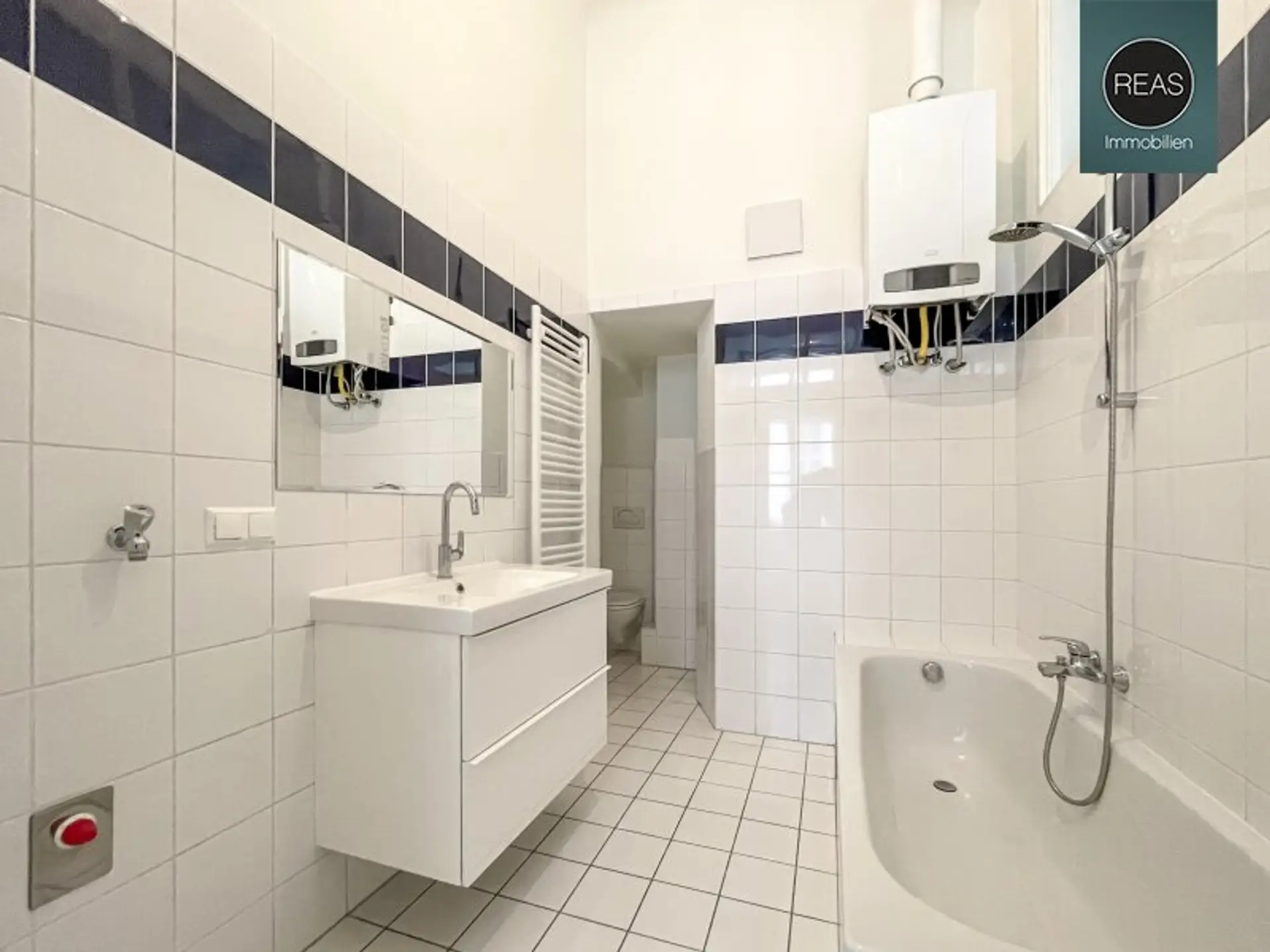 * 1 BAD mit WC, Badewanne, Waschbecken, Waschmaschinenanschluss sowie einer Oberlichte und einem kleinen Fenster zu einem Lüftungshof