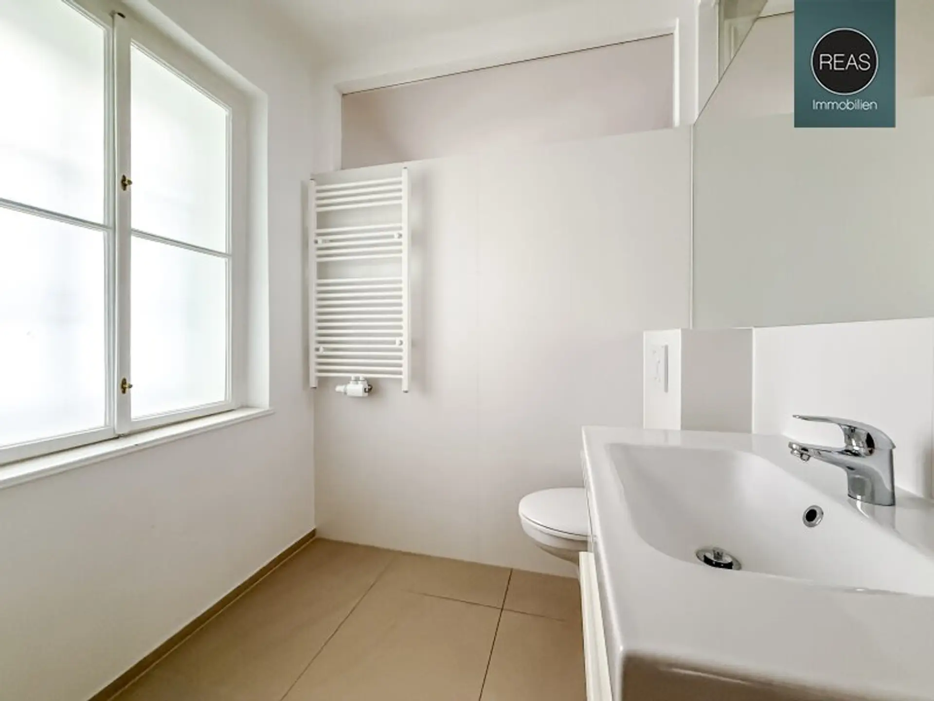 * 1 Bad mit WC, Dusche, Waschbecken mit Unterschrank und Spiegel, Handtuchheizkörper sowie Oberlichten