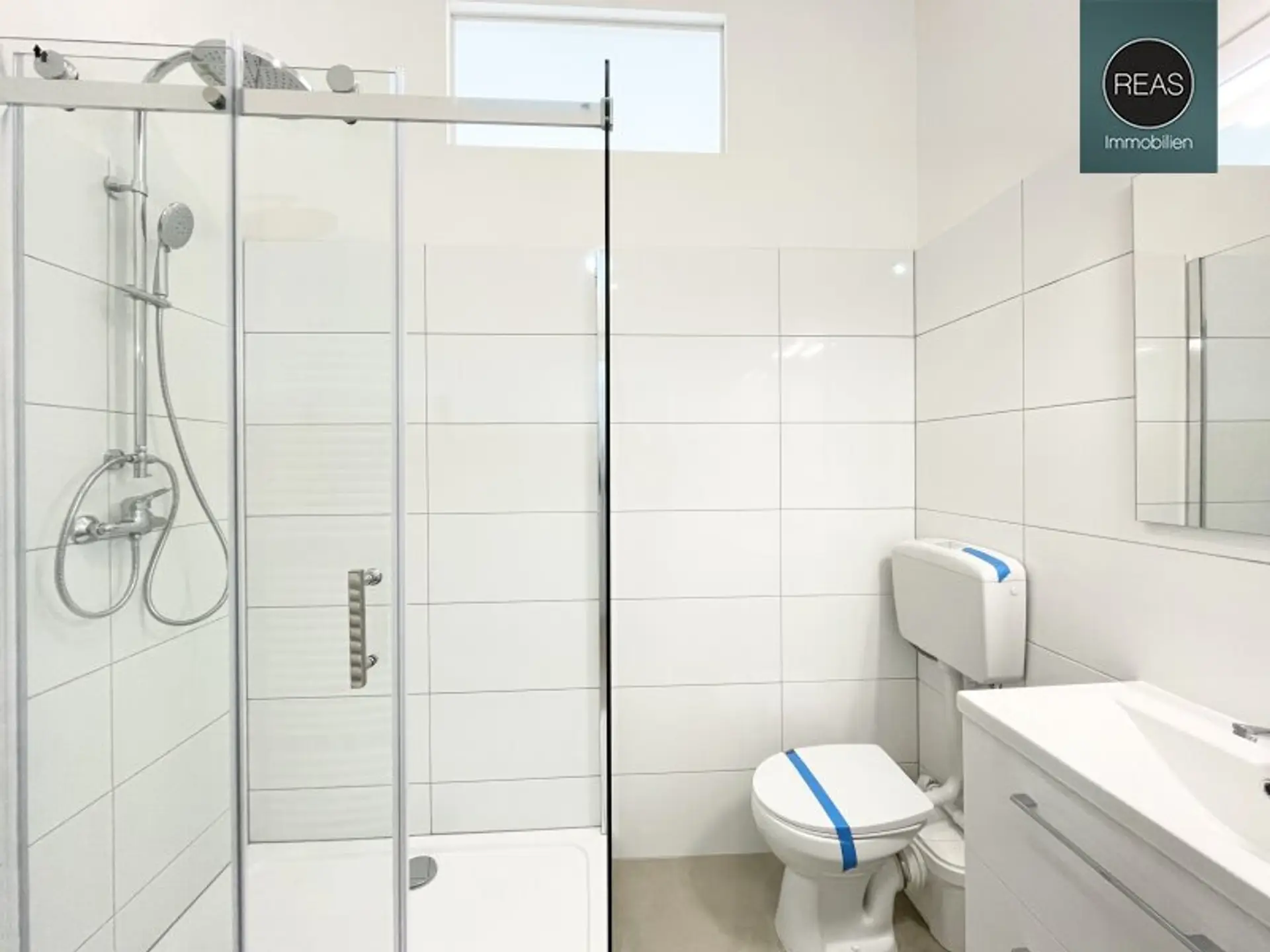 * 1 Bad/WC mit WC, Dusche, Waschbecken samt Unterschrank, Spiegel und Beleuchtung, einem Handtuchheizkörper sowie Oberlichten