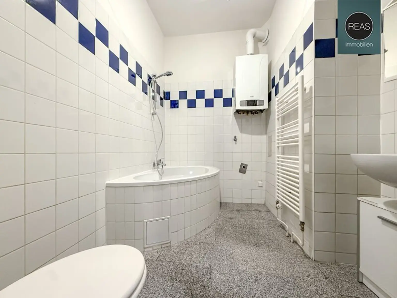 * 1 Badezimmer mit WC, Eckbadewanne, Waschbecken, Handtuchheizkörper sowie einem Waschmaschinenanschluss