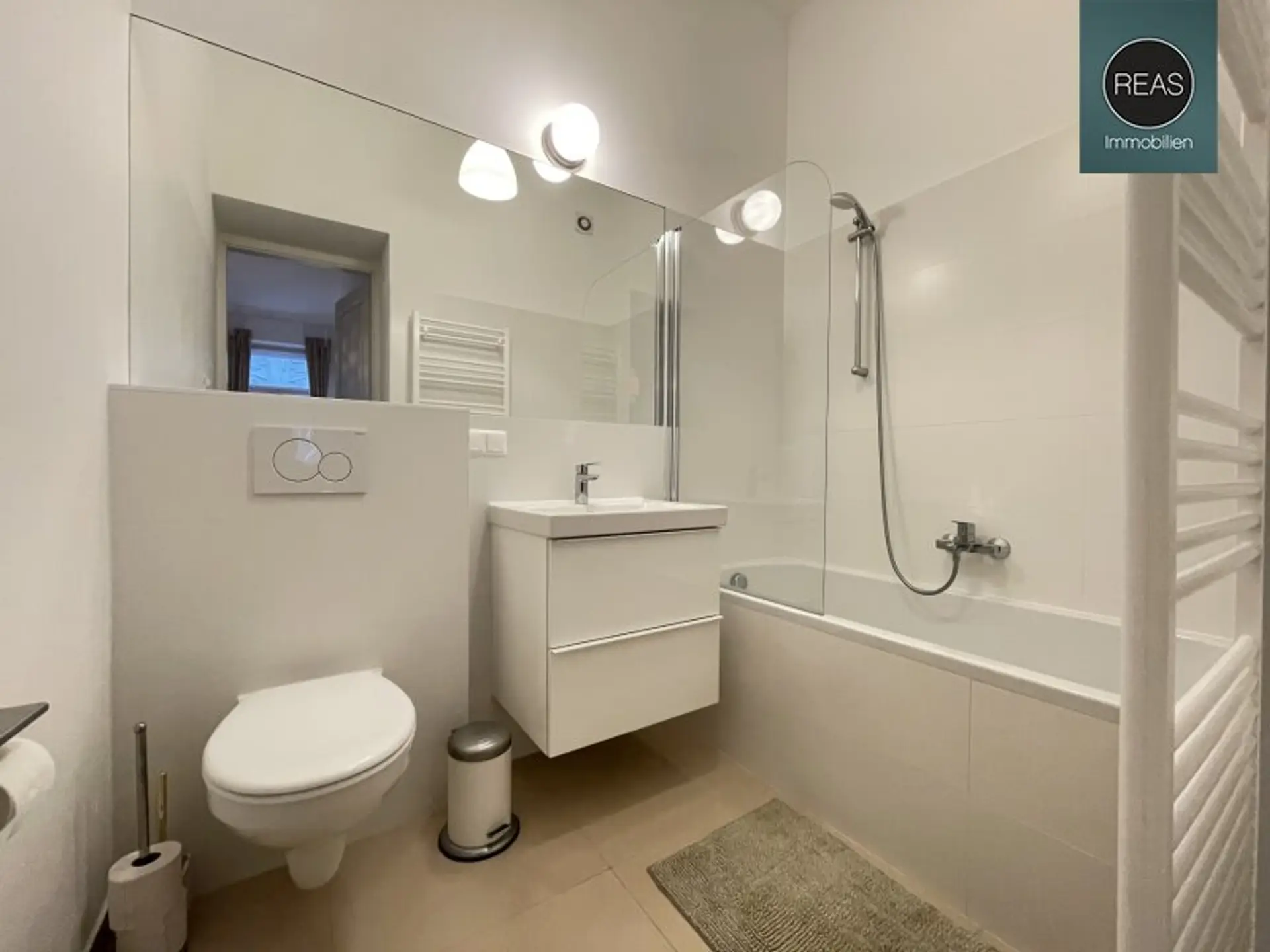 * 1 Badezimmer mit WC, Badewanne mit Duschwand aus Glas, Waschbecken mit Unterschrank und Spiegel sowie einem Handtuchheizkörper