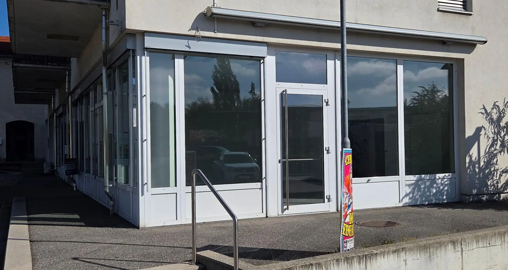 In zentraler Lage direkt neben dem Kreisverkehr am Ortsanfang, neben Polizei, Raika und Möbel Polt, befindet sich diese 72,30 m² vielseitig verwendbare Geschäftsfläche im Erdgeschoss eines 2008 erbauten Gebäudes.