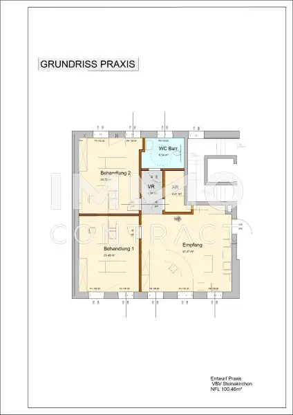 Der Kundenzugang erfolgt vom 1. OG, welcher unmittelbar vom Parkplatz mit 13 Stellplätzen aus erreicht werden kann. Das Objekt ist barrierefrei ausgeführt und mit einem Lift ausgestattet. Das großzügig angelegtes Foyer im 2. OG kann als erweiterter Wartebereich genutzt werden. Die Nutzung als Ordination bzw. Praxis im Gesundheitsbereich bietet sich an, da bereits 2 Allgemeinmediziner im Haus Ihrer Tätigkeit nachgehen.