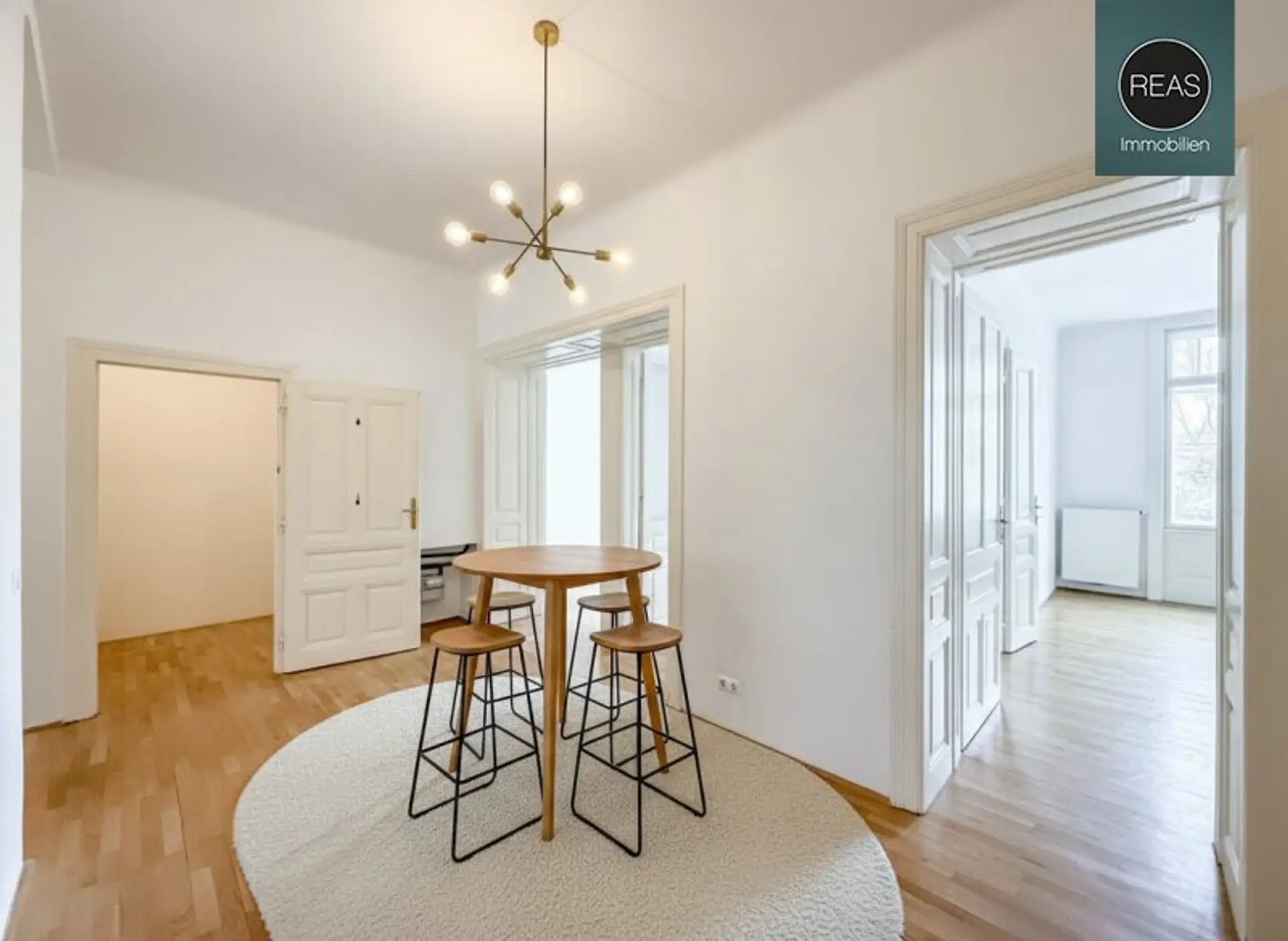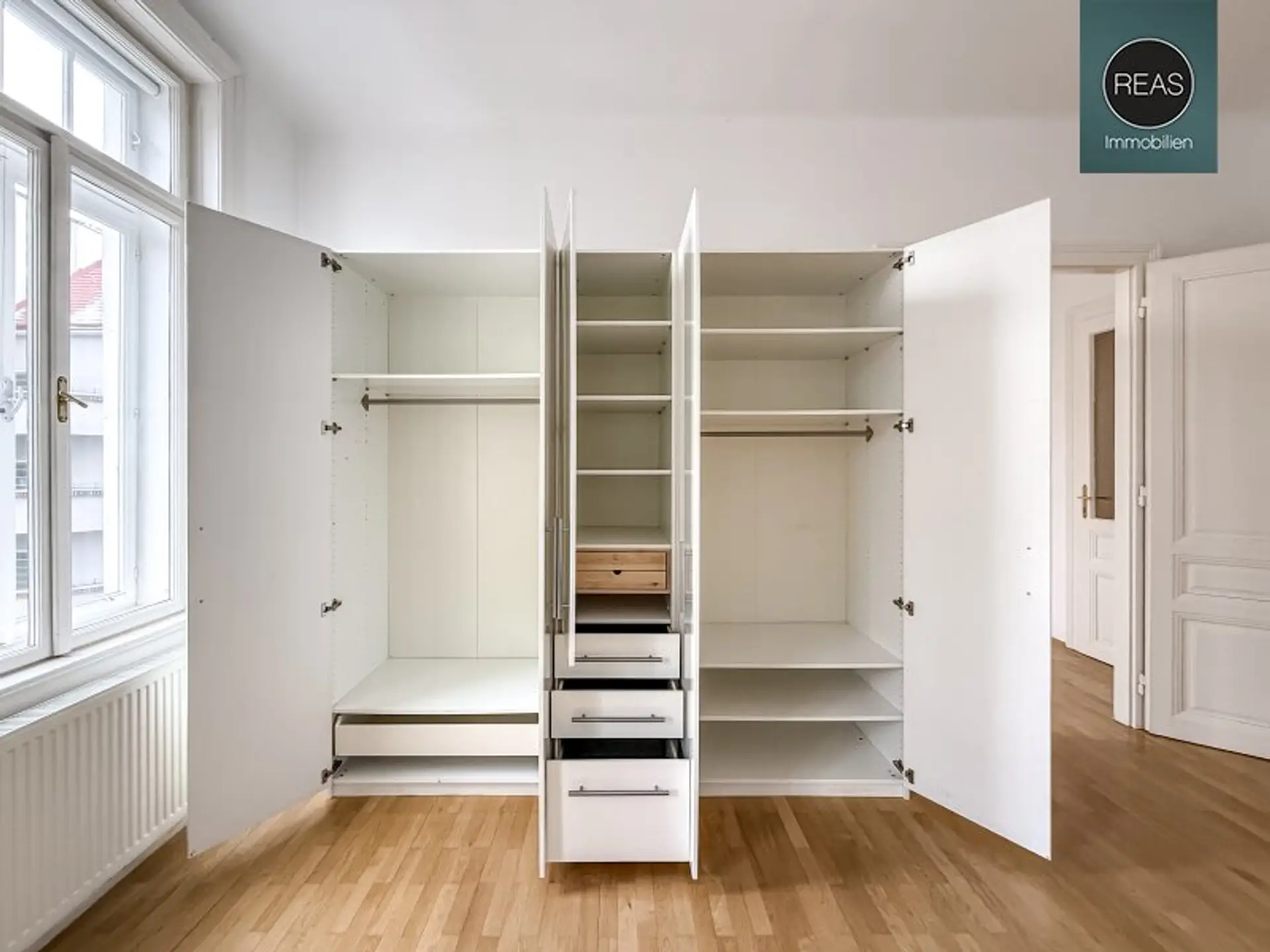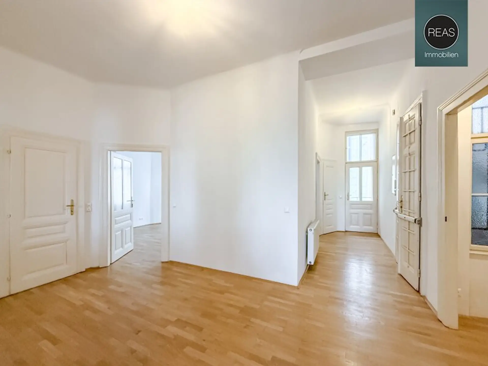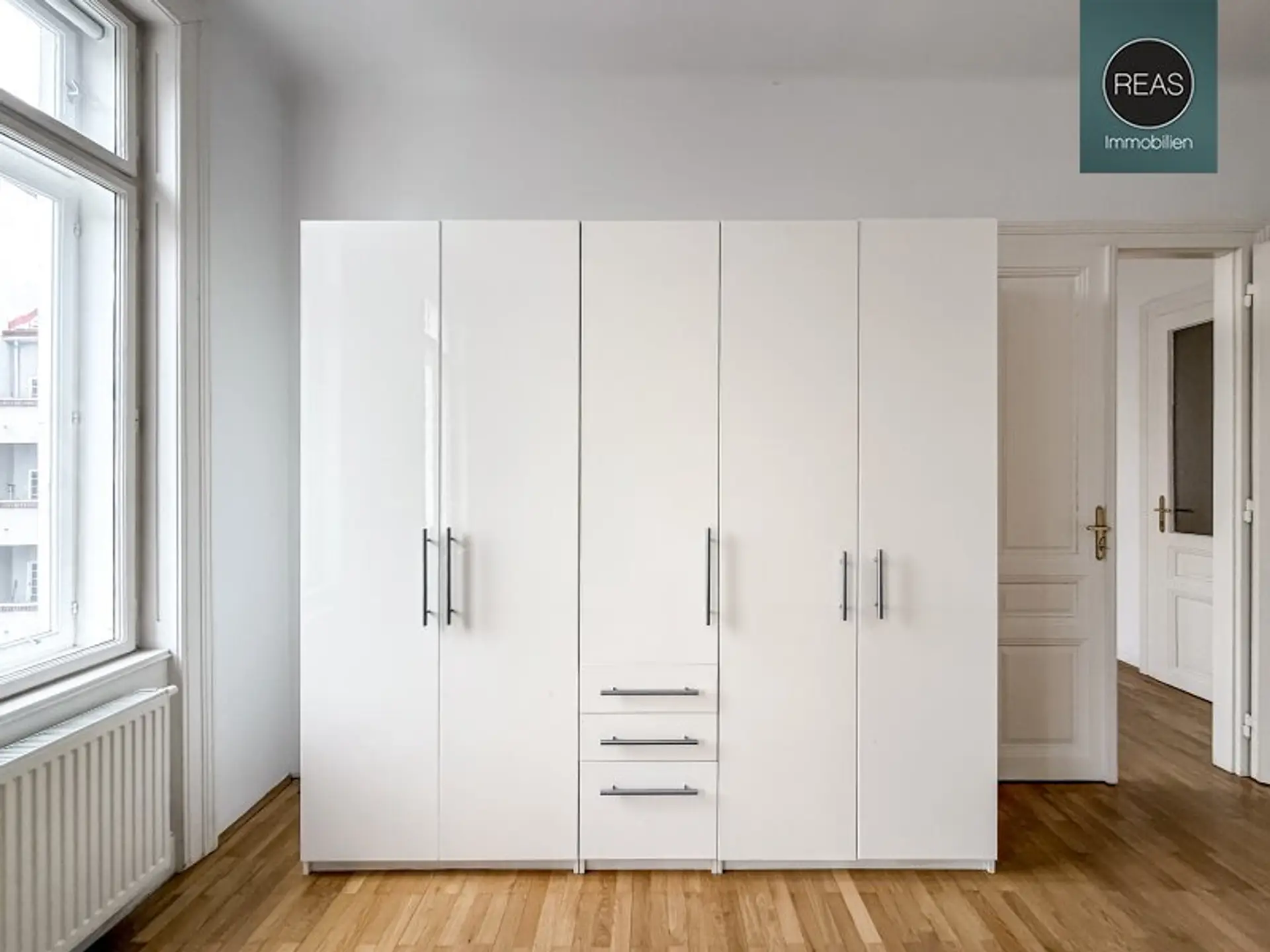Zur hochwertigen Ausstattung gehören: Echtholz-Parkettböden, Einbauküche inkl. aller Geräte, 2 kleine Balkone, Flügeltüren, uvm.