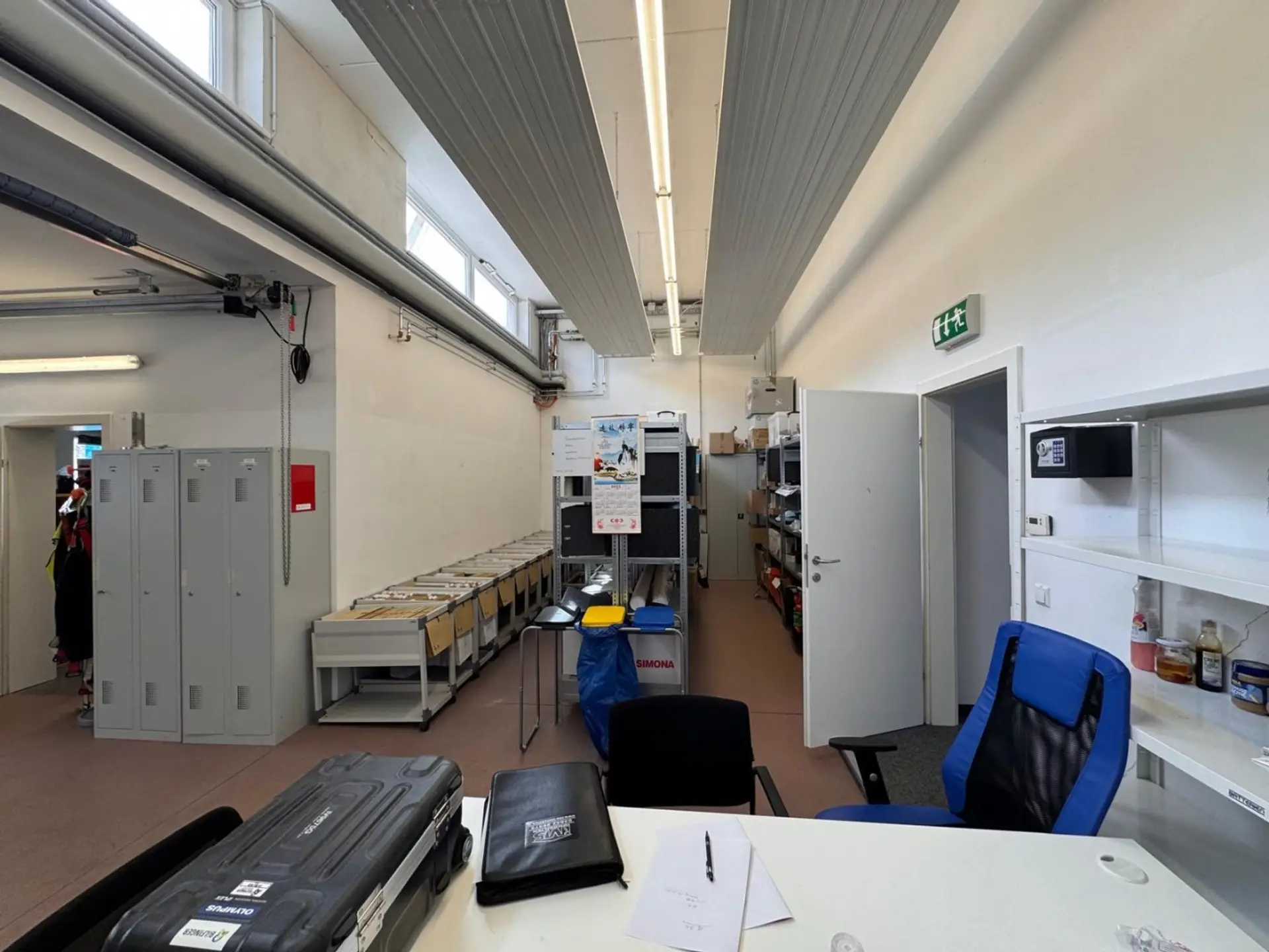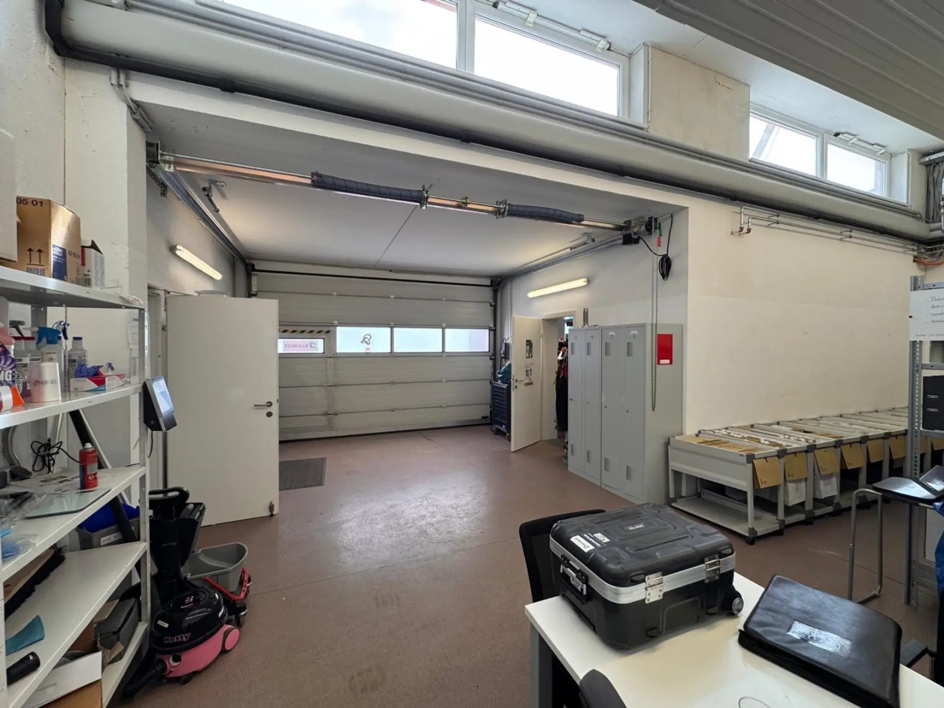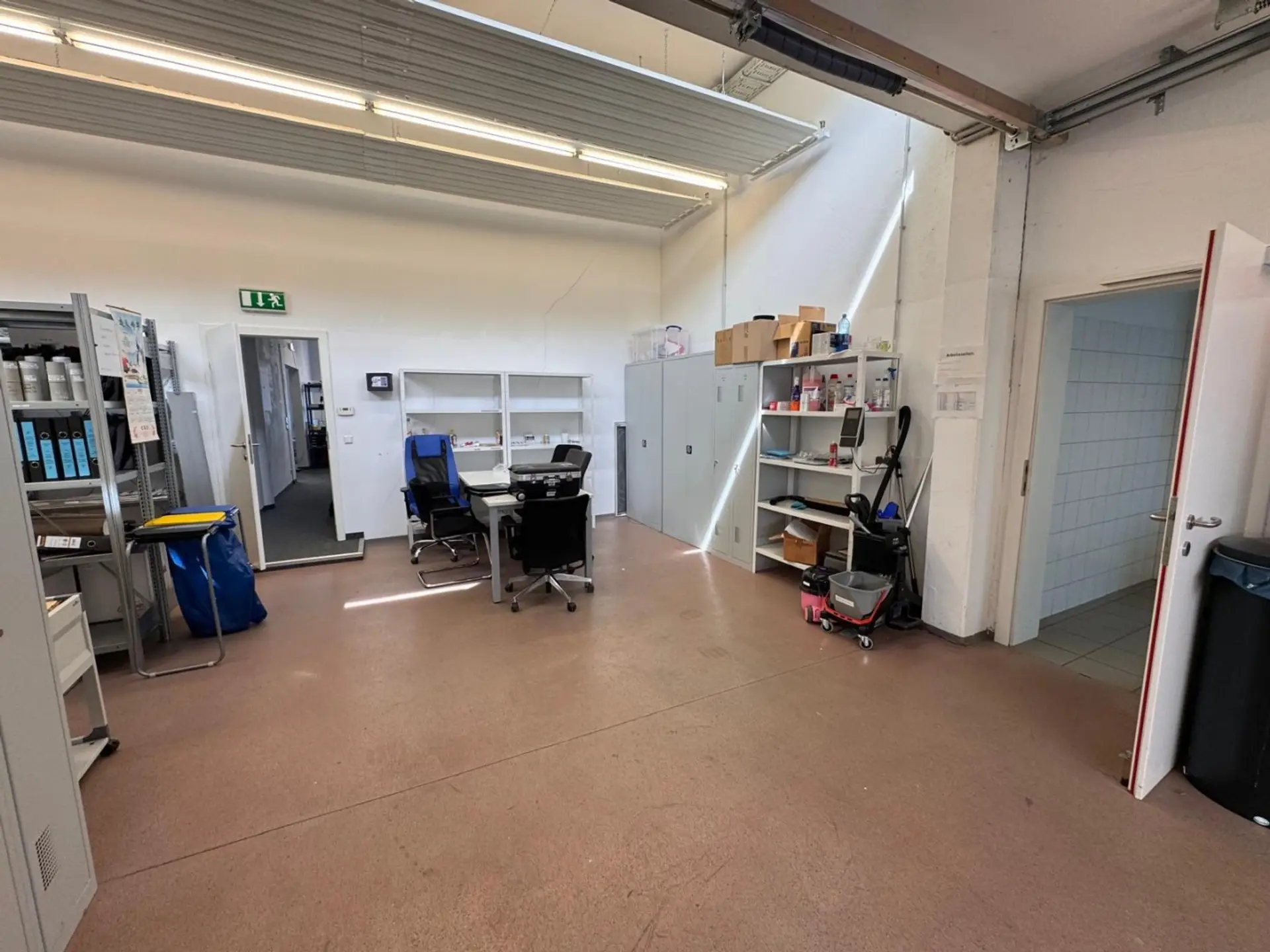 Die Büroräume selbst sind mit ausreichend Leuchtkörpern und Stromanschlüssen versehen und bieten weiters eine Lagerhalle mit einem Sektionaltor mit Tür, eine Mitarbeiterküche und Sanitäranlagen.