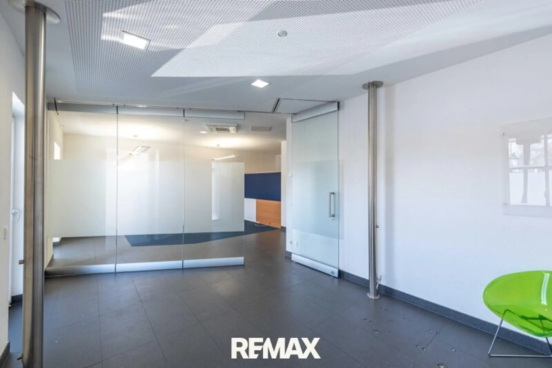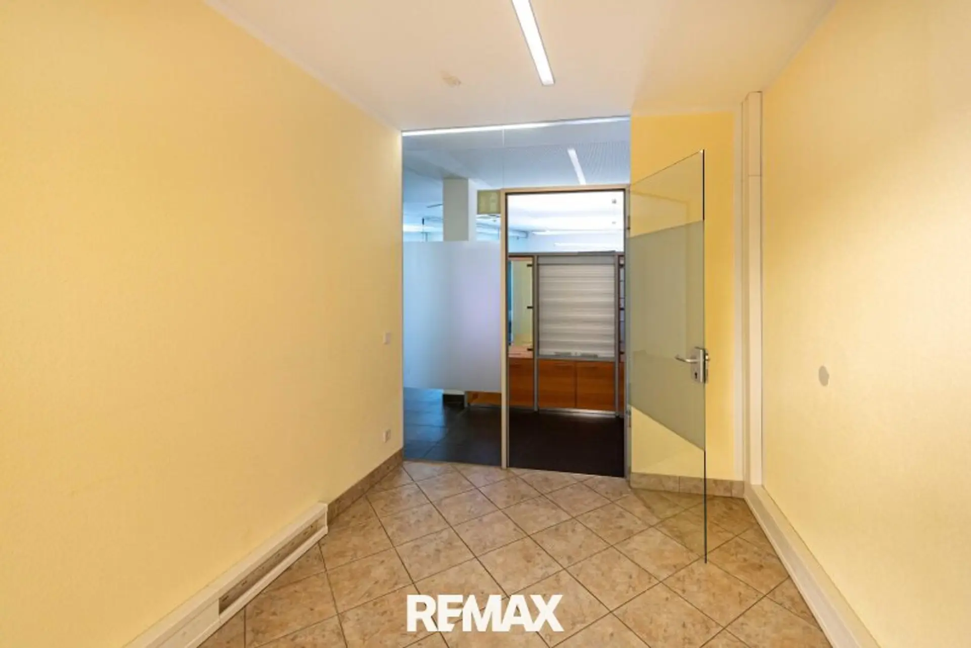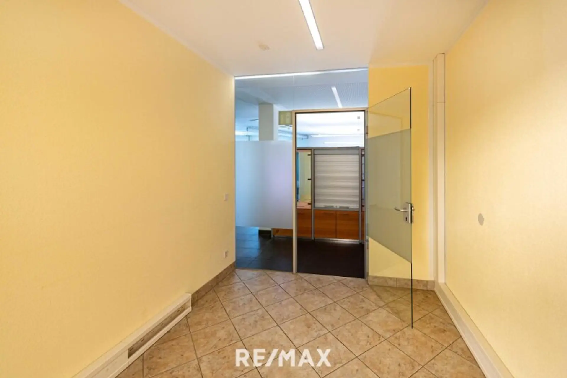 Beim Betreten empfängt ein großzügiger Eingangsbereich, der durch eine moderne Glastrennwand geteilt ist. Diese kann bei Bedarf aufgeschoben werden und lässt Raum für kreative Nutzung – ob Empfang, Wartezone oder zusätzlicher Arbeitsplatz. Dahinter liegt ein ruhiges Einzelbüro, das sich perfekt für konzentriertes Arbeiten eignet. Ein weiteres Zimmer kann als zweites Einzelbüro dienen oder als Verbindung zum rückseitigen Ausgang fungieren, ideal für interne Abläufe oder als diskreter Zugang.