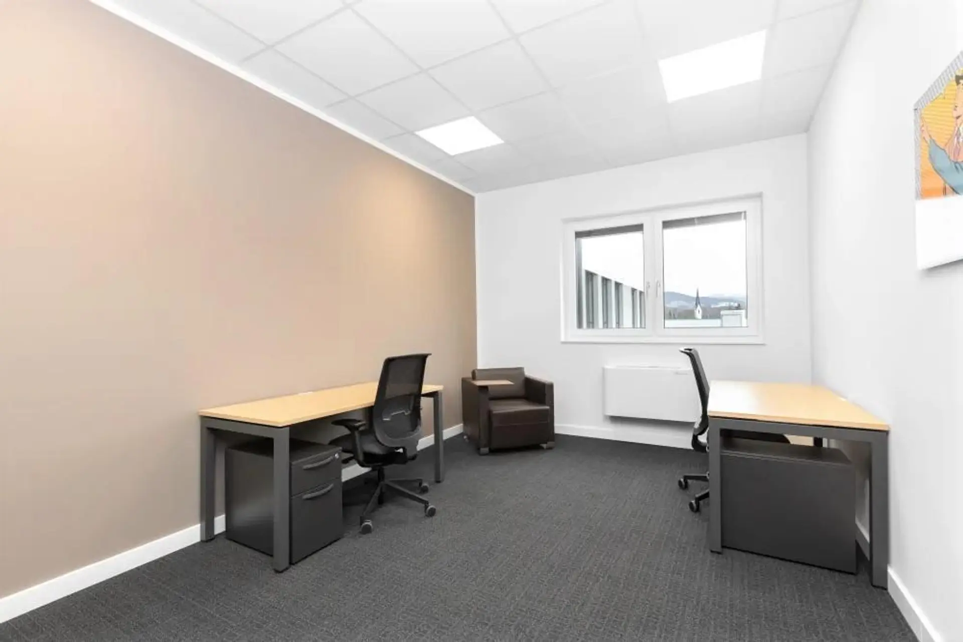 Jeder Büroraum ist modern ausgestattet und beinhaltet Schreibtisch(e), Bürostühle, Aktenschränke, Telefon, Internet und Klimaanlage.