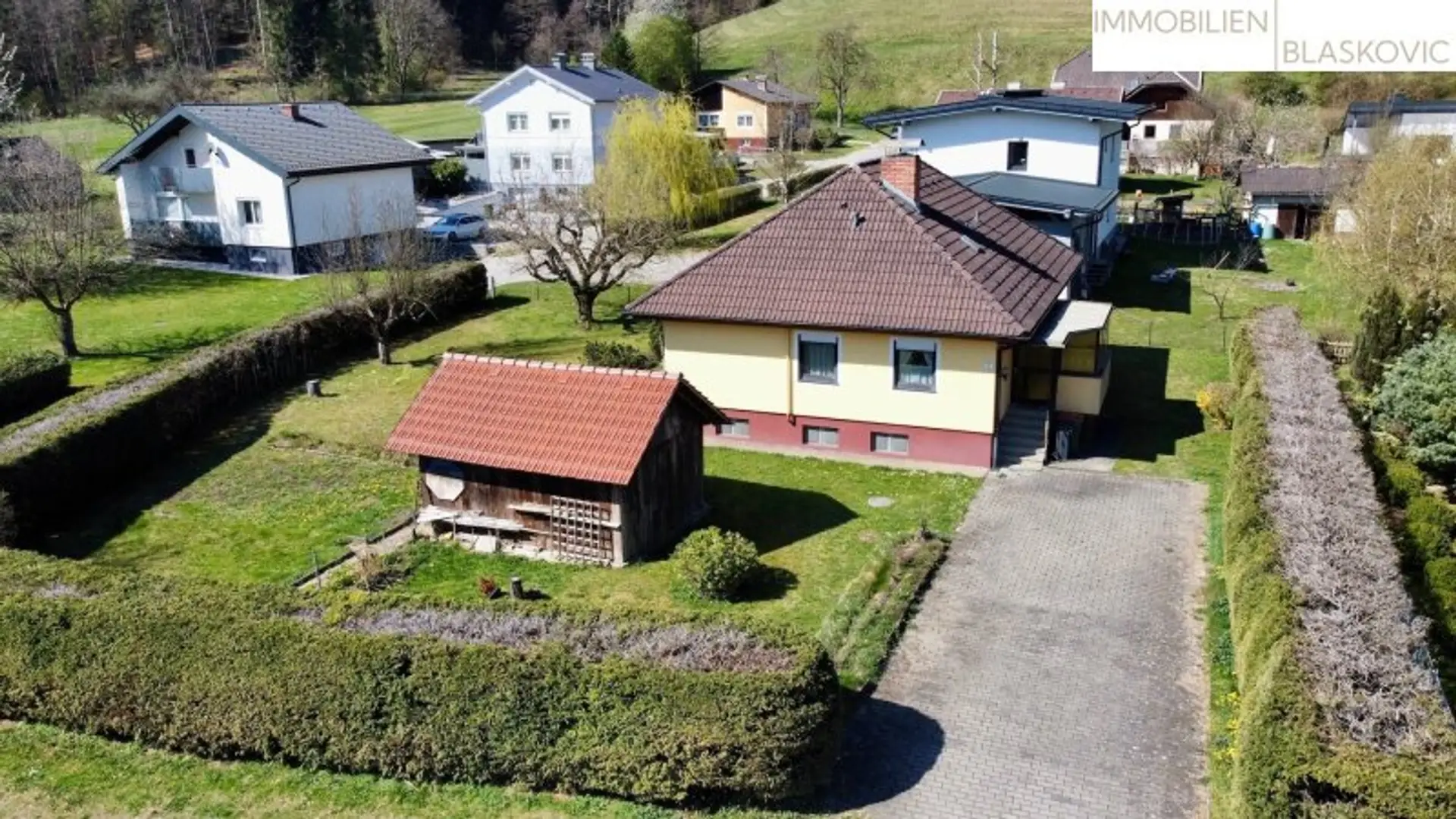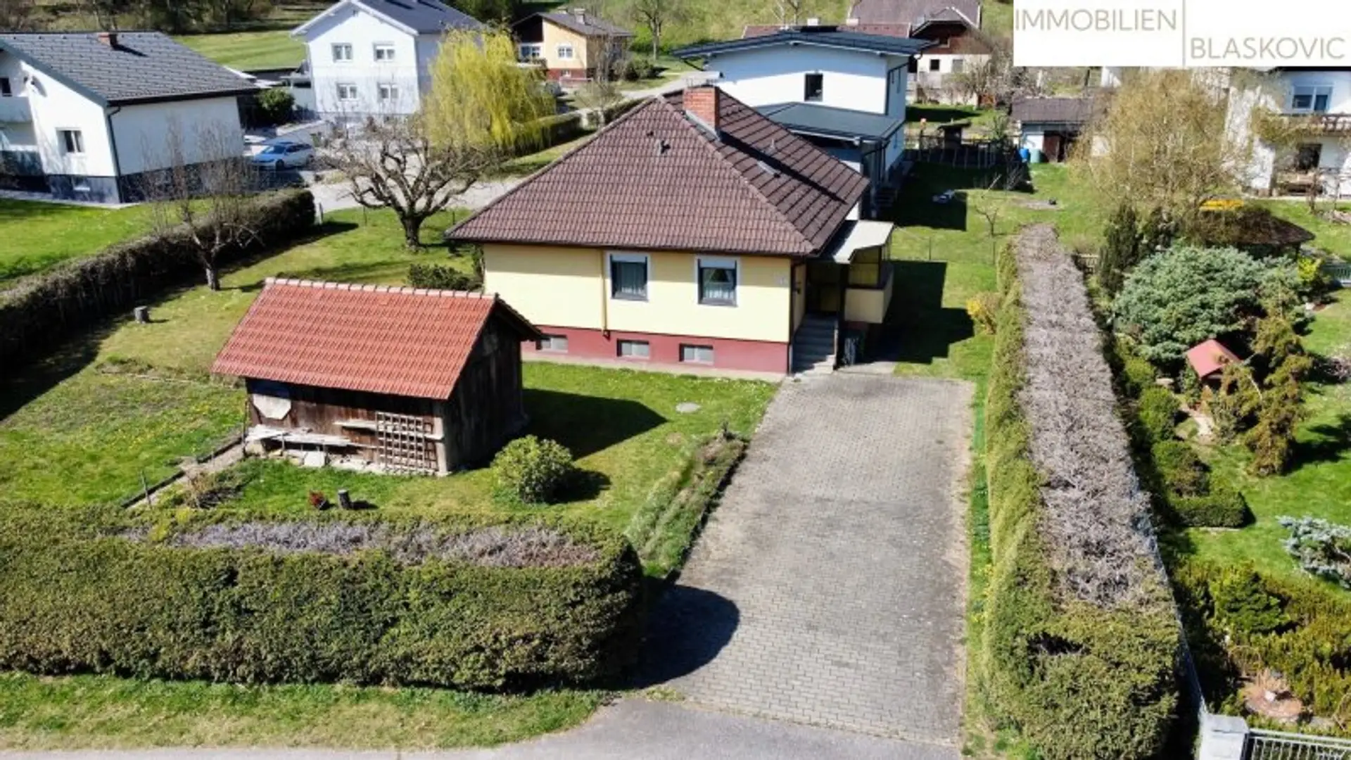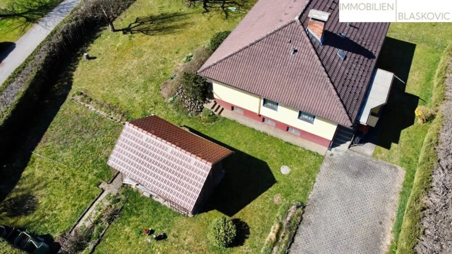 Die Einfahrt ist gepflastert und bietet Platz für das KFZ. Außerdem befindet sich noch ein Geräteschuppen am Grundstück