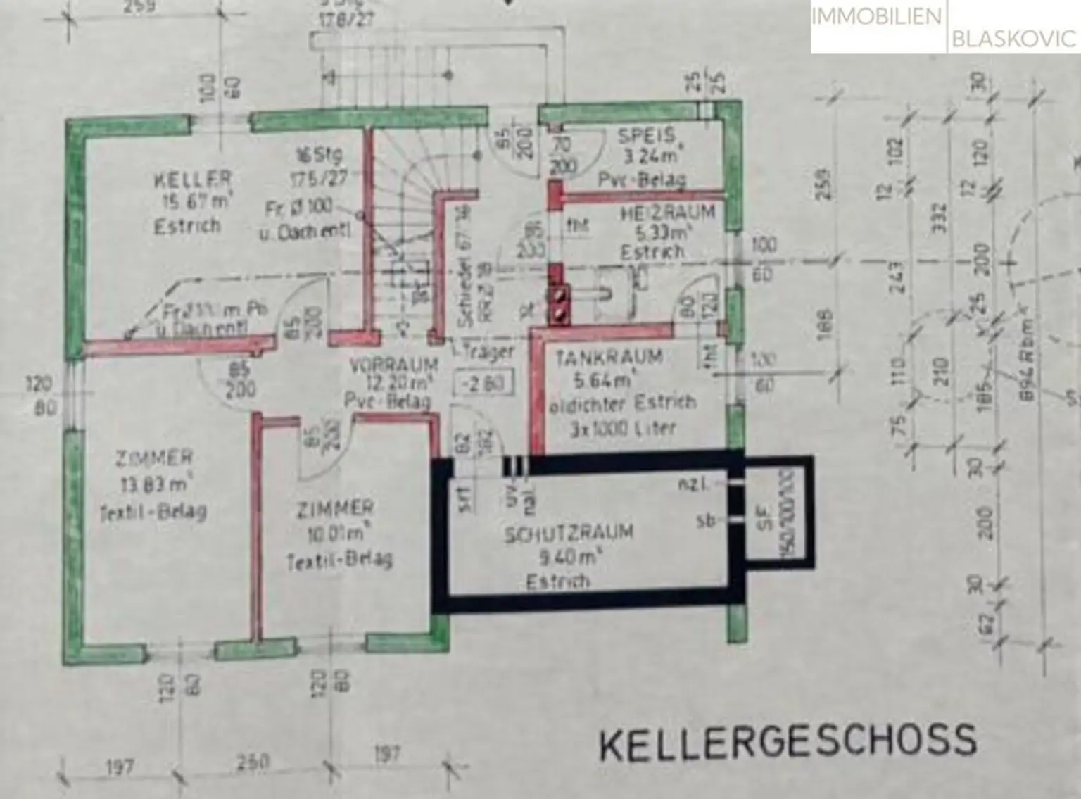 Die Kellerfläche misst rund 75 m2, wobei ca. 39 m2 ausgebaut sind. Der Rest verteilt sich auf diverse Heiz- und Technikräume. Der Keller wurde mit 30 cm Schallsteinen und Betonfüllung errichtet.