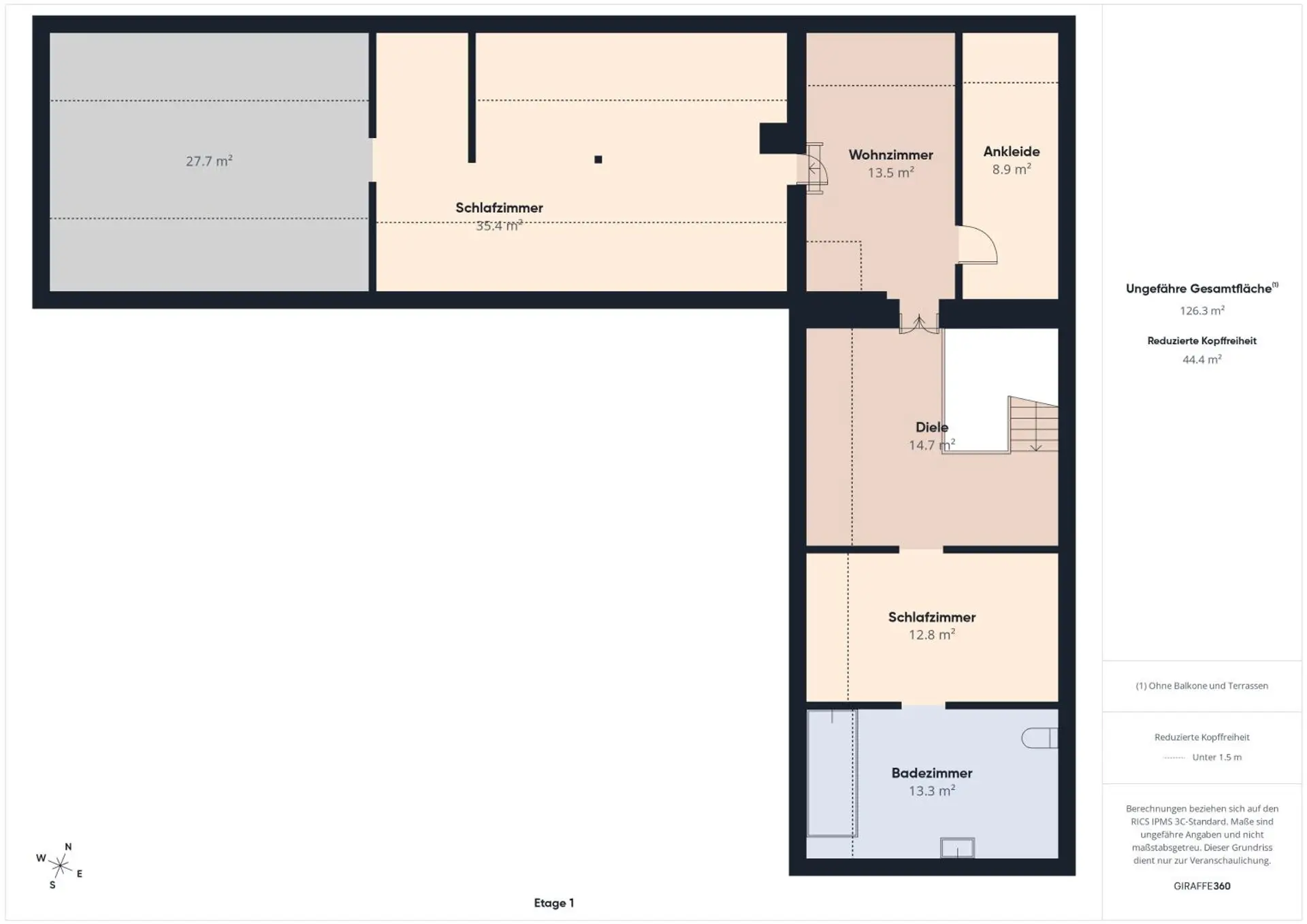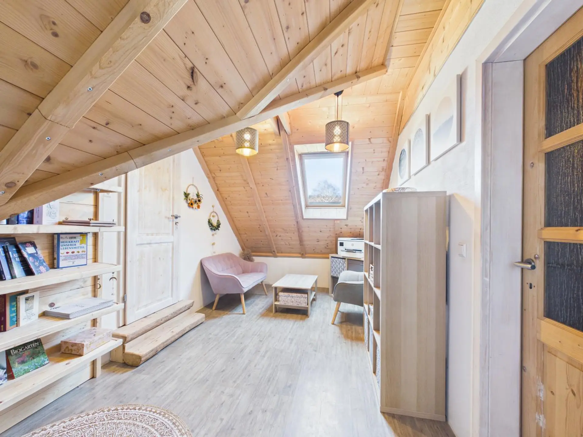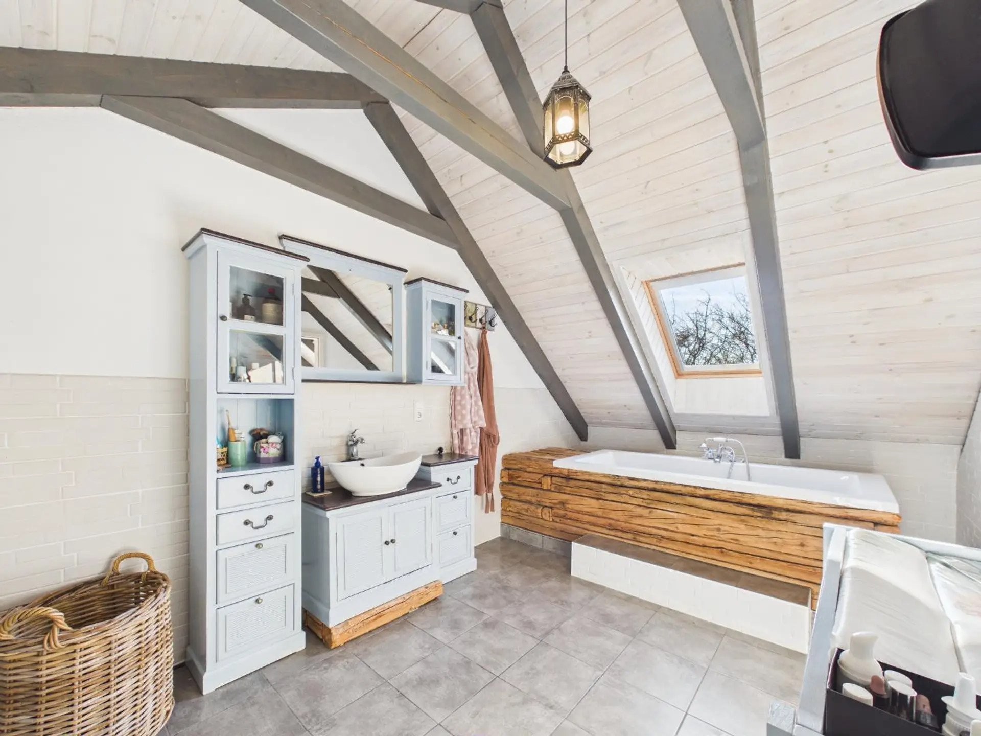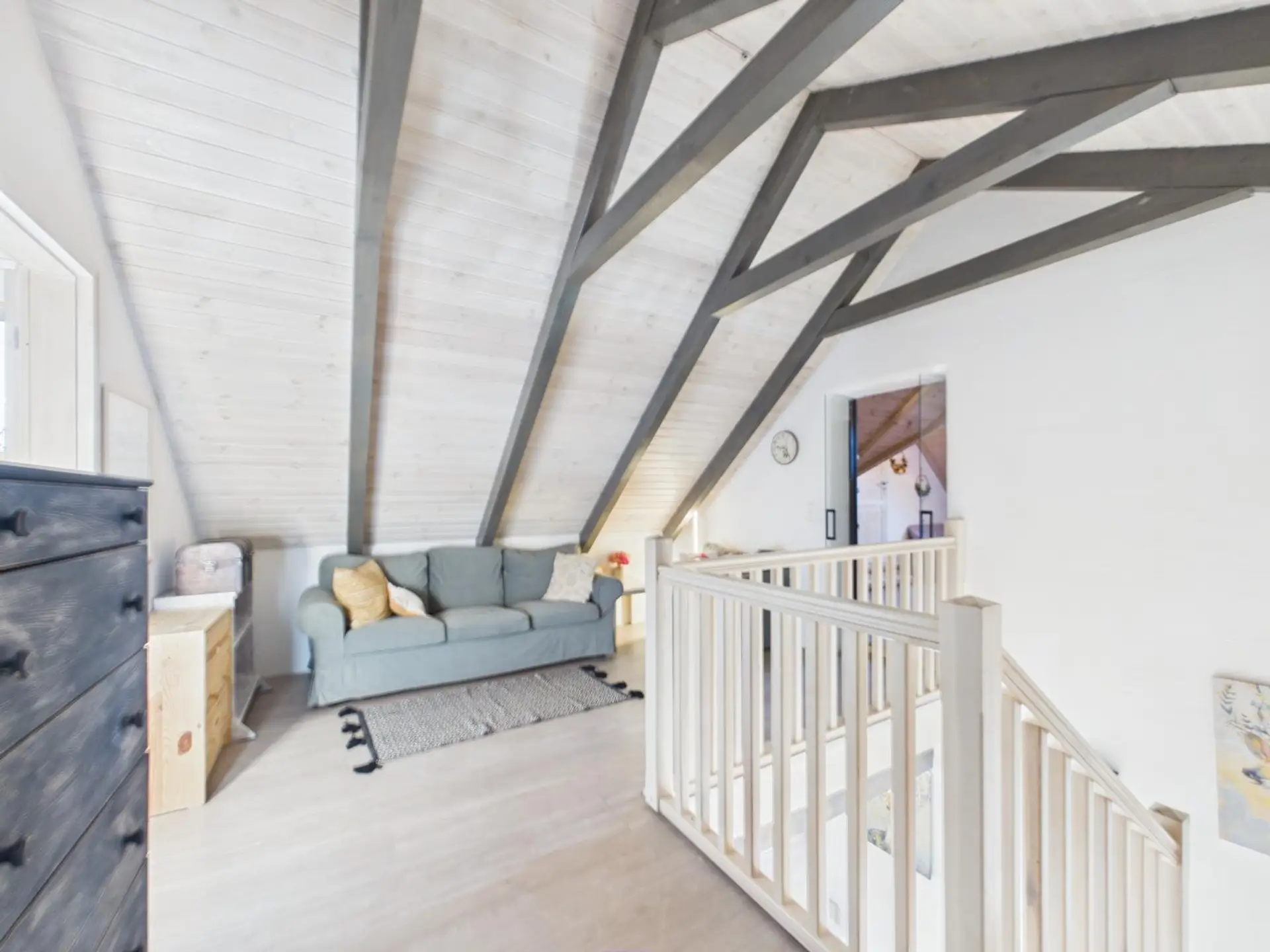Über eine stilvolle Holztreppe gelangt man ins Obergeschoss, wo sichtbare Dachbalken für ein warmes, wohnliches Ambiente sorgen. Das Hauptschlafzimmer bietet einen geschützten Rückzugsort. Ein besonderes Highlight ist das Badezimmer mit freistehender Badewanne unter dem Dachflächenfenster – ein Ort für entspannte Stunden mit Blick in den Sternenhimmel. Zwei weitere Zimmer sowie zusätzliche Stauraummöglichkeiten runden das Raumangebot ab.