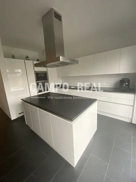 Hier ist linkerhand die top ausgeführte Maß-Küche mit zentral platziertem Arbeits- bzw. Bar-Block untergebracht, wo man Ausblick über den ganzen Garten sowie direkten Zugang zur Terrasse und damit auch direkte Lüftungsmöglichkeit hat. Die mittig angesiedelte Treppe, die in das OG und KG führt, ist von stylischen Stahlseilen getragen, die massiven Trittflächen sind aus Eichenholz gefertigt und verbinden gekonnt Eleganz mit Stabilität.
