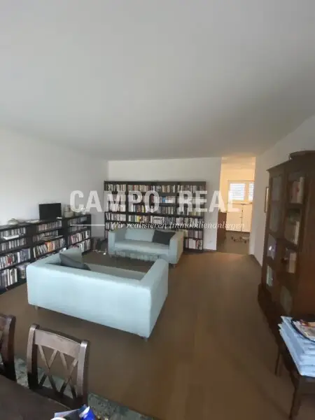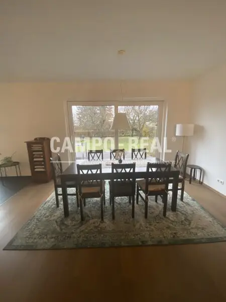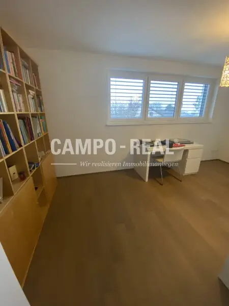 Rechterhand und auf kurzem Weg von der Küche weg befindet sich zunächst ein großzügiger Essbereich, wo 8 – 10 Personen gut Platz finden. Hier schließt dann noch der gemütliche Wohn(zimmer)bereich an, wo eine große Wand mit Einbau-Bücherregalen bestellt ist, die anderen zwei Wände Platz für Sideboards und bei Bedarf für einen Geschirrschrank bereithalten. Das ganze EG ist aufgrund der großen Glasschiebetüren, die direkt auf die großzügige Außenterrasse führen und weiterer Fenster sehr hell und lichtdurchflutet. Für den Sommer gibt es automatische neigungsverstellbare Jalousien als Licht- und Sonnenschutz. Wohn- Essbereich und Arbeitszimmer sind mit Parkett und Küchenbereich und alle anderen Räumlichkeiten mit hochwertigen Fliesen ausgestattet.