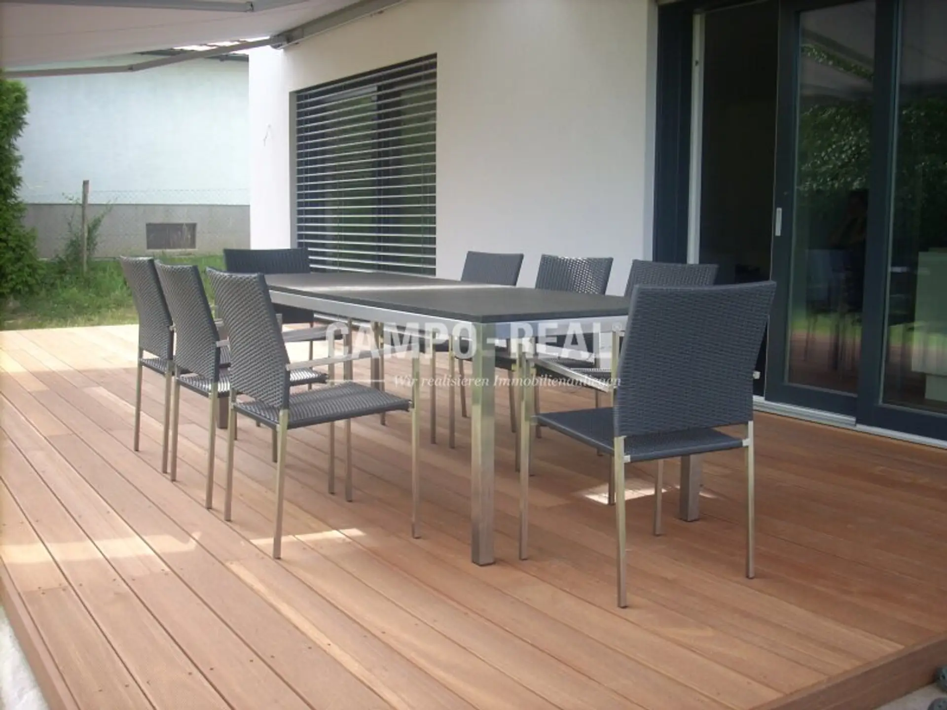 Den Garten erreicht man ebenerdig direkt über die große Terrasse (31 m2). Die Terrasse ist mit einem Lärchenbelag (32/146 mm) mit Unterkonstruktion gefertigt. Zwei nebeneinander liegende wetterfeste Markisen, die mit einer Motorsteuerung ohne Mühe ein- und ausgefahren werden können, sorgen für gemütliche Atmosphäre mit oder ohne Sonneneinstrahlung.
