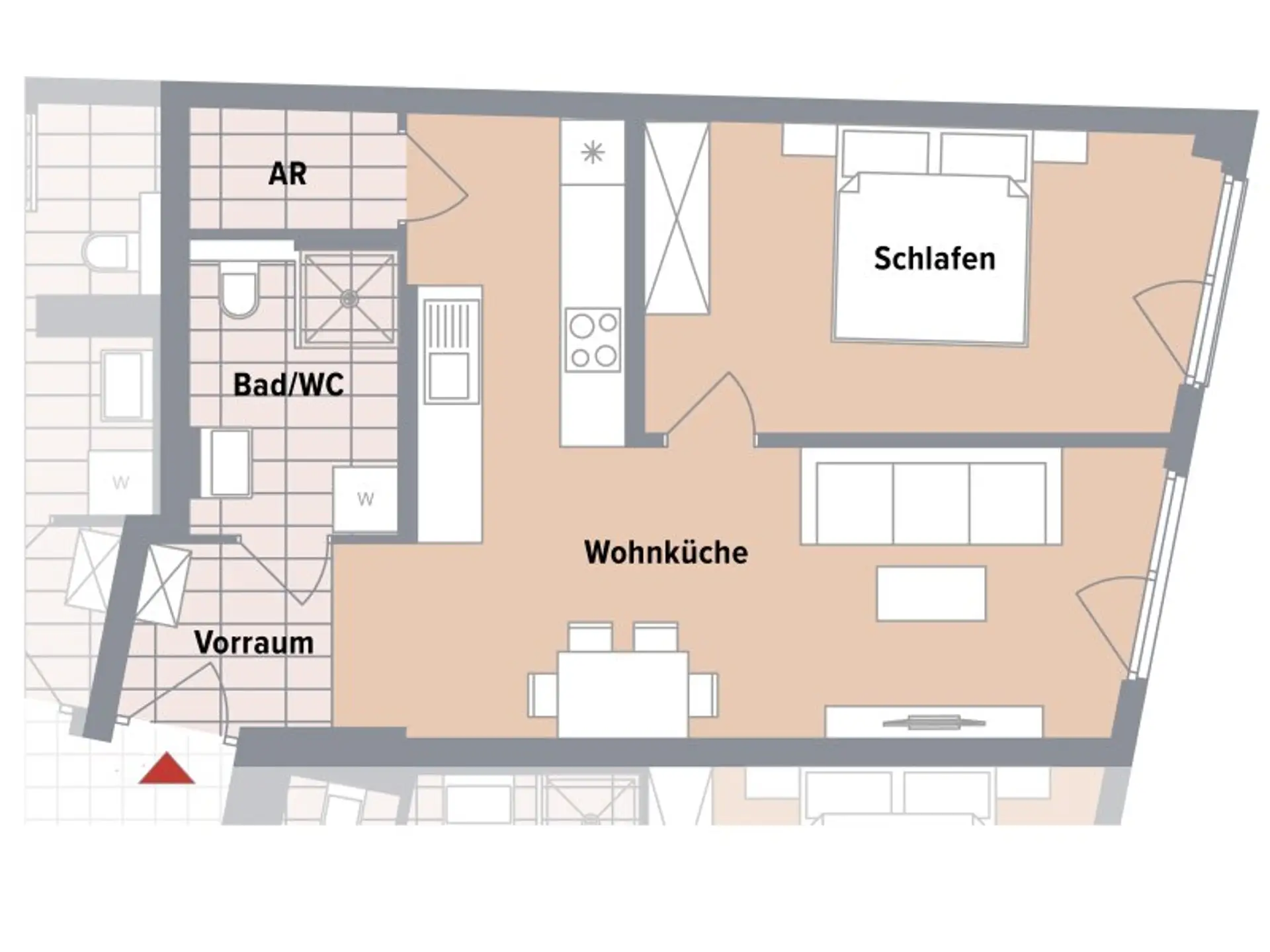 Ein Badezimmer mit WC, ein gut nutzbarer Vorraum sowie ein praktischer Abstellraum sind sinnvoll in den Grundriss integriert und unterstreichen die Alltagstauglichkeit der Wohnung.