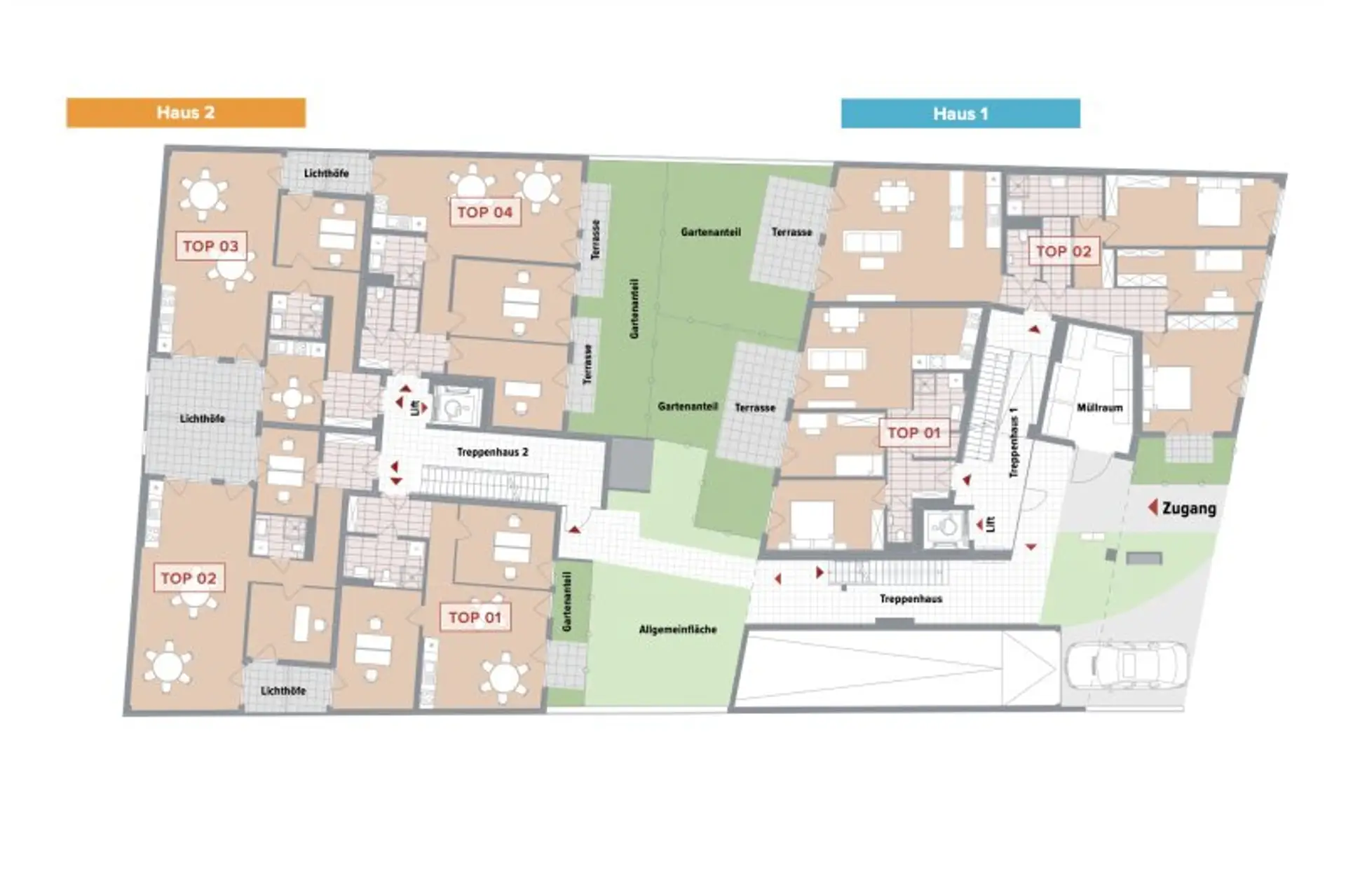 Die Wohnungen reichen von Gartenwohnungen über großzügige Familienwohnungen bis hin zu durchdacht geplanten Dachgeschosswohnungen. Ein Großteil der Einheiten verfügt über private Freiflächen – Eigengärten, Terrassen oder Balkone – und schafft damit wertvolle Außenräume für den Alltag.