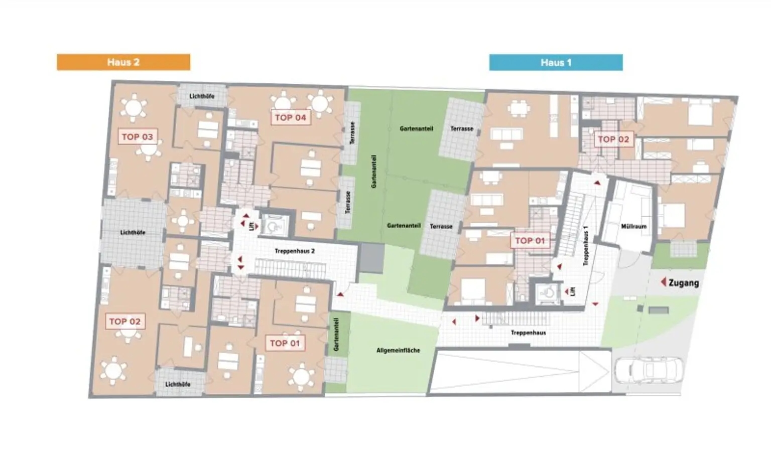 Die 4 Gewerbeflächen im Erdgeschoss sind als hochwertige Arbeits- und Praxisräume geplant. Je nach Einheit stehen private Freiflächen wie Terrassen, Gärten oder Lichthöfe zur Verfügung. Flexible Grundrisslösungen ermöglichen eine Nutzung als Büro, Ordination oder Dienstleistungsfläche.