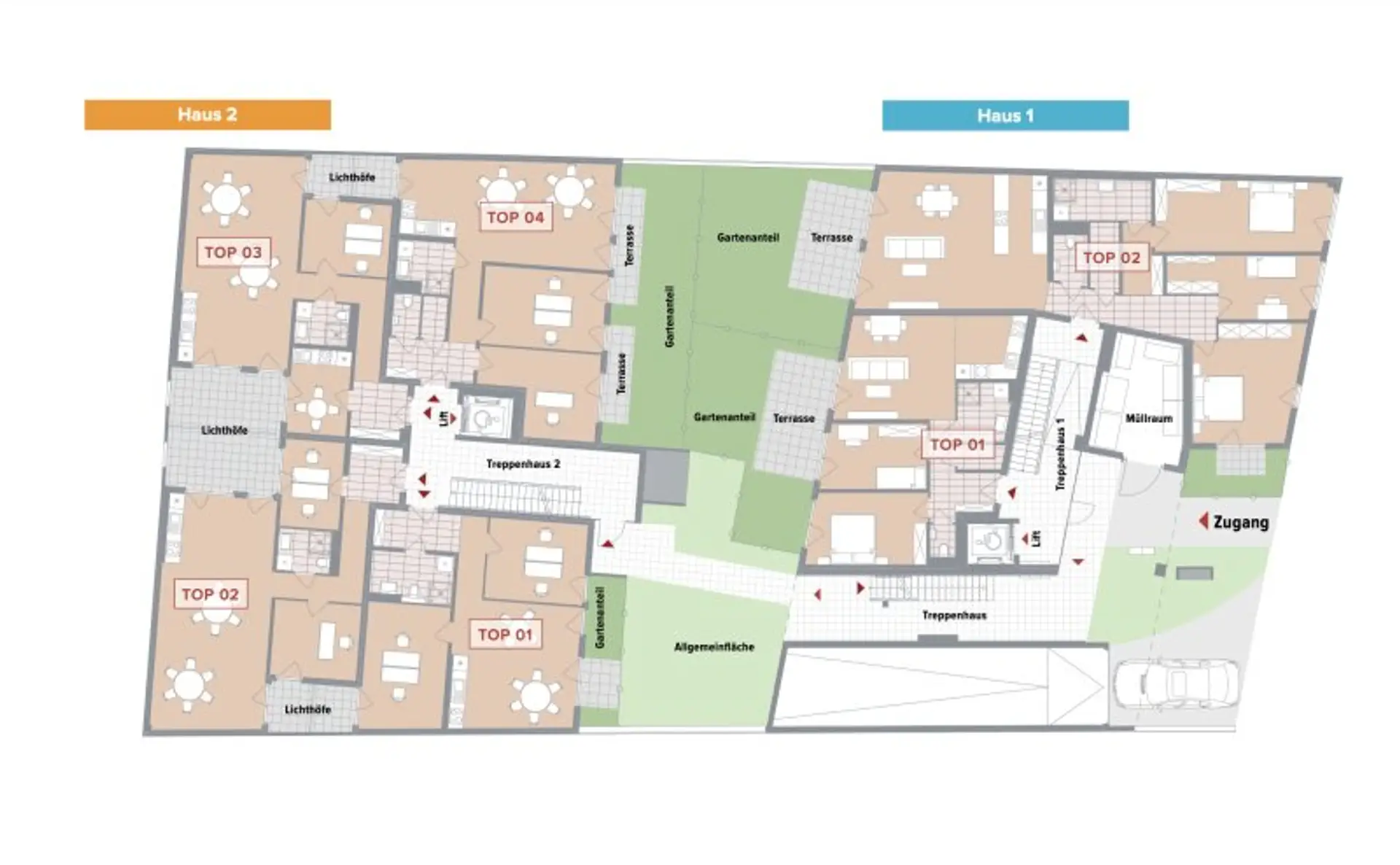 Die 4 Gewerbeflächen im Erdgeschoss sind als hochwertige Arbeits- und Praxisräume geplant. Je nach Einheit stehen private Freiflächen wie Terrassen, Gärten oder Lichthöfe zur Verfügung. Flexible Grundrisslösungen ermöglichen eine Nutzung als Büro, Ordination oder Dienstleistungsfläche.
