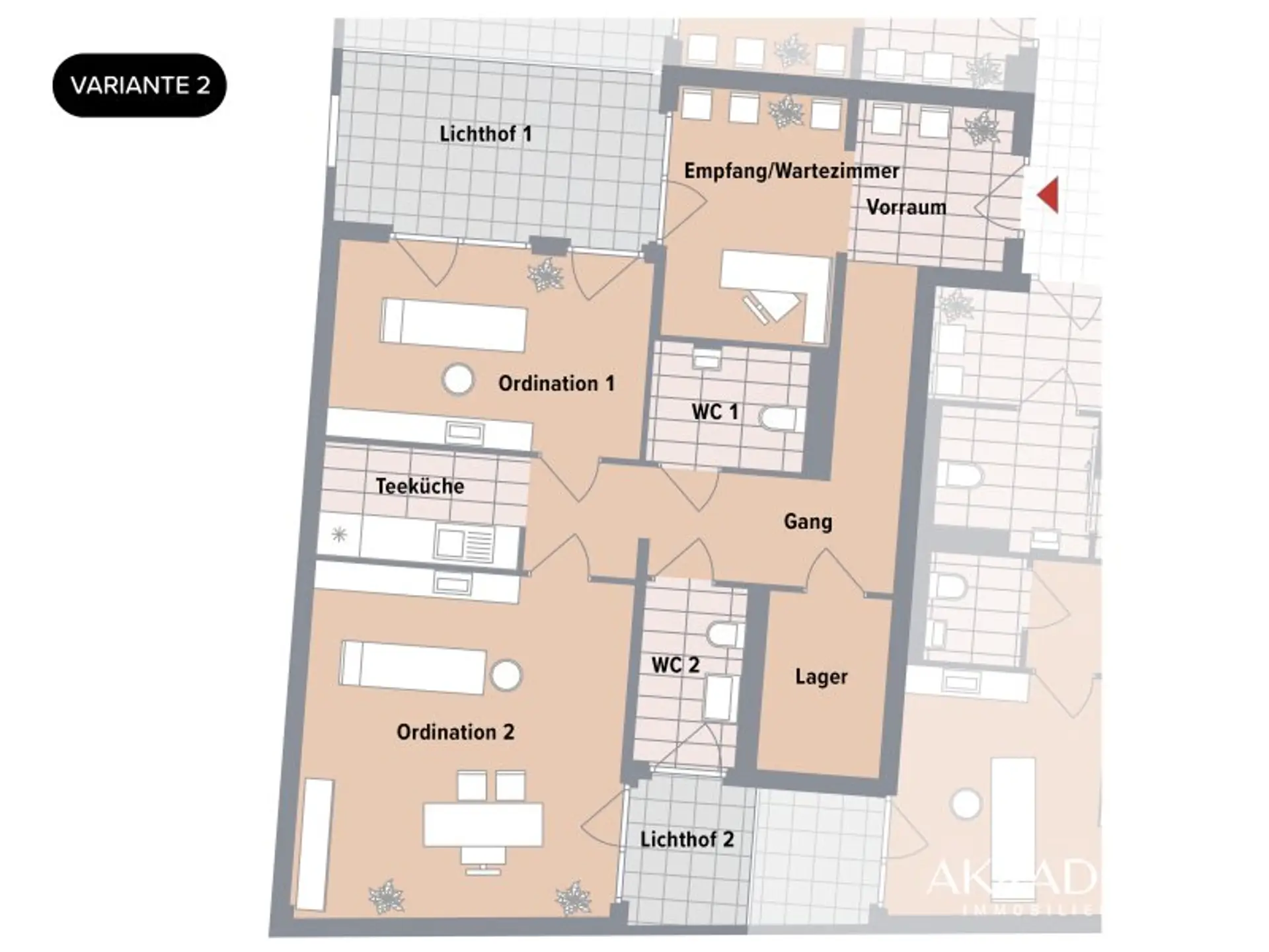 Ergänzt wird das Raumangebot durch eine Teeküche, zwei separate WCs, einen Lagerraum, einen Vorraum sowie einen Gang. Zwei Lichthöfe sorgen für natürliche Belichtung und eine angenehme Arbeits- und Aufenthaltsatmosphäre.