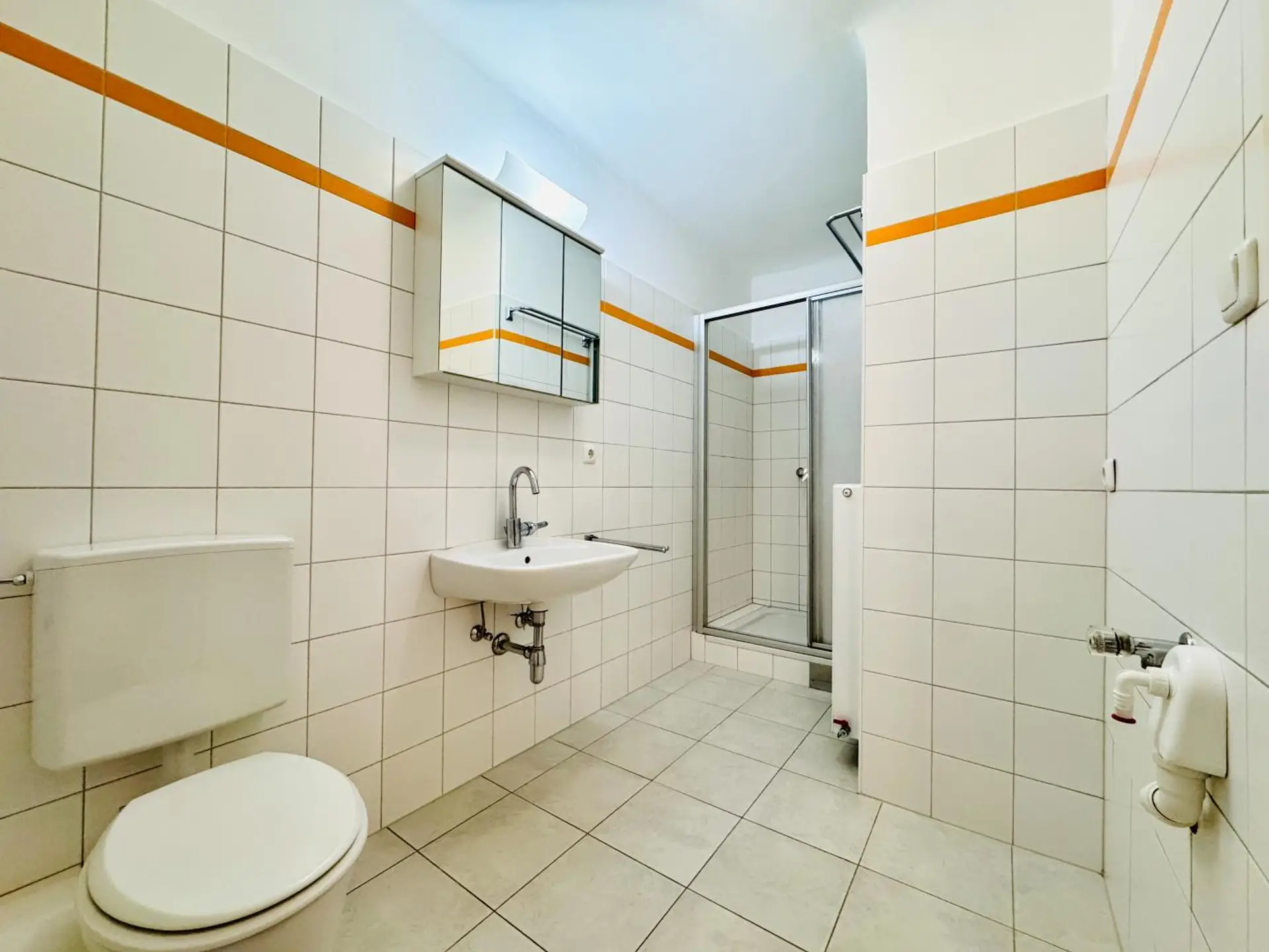 Das Badezimmer ist mit einer Dusche, einem Waschbecken mit Spiegelschrank, einer Toilette und einem Waschmaschinenanschluss ausgestattet. Ein Abstellraum rundet das Paket innerhalb des Wohnungsverbandes ab.