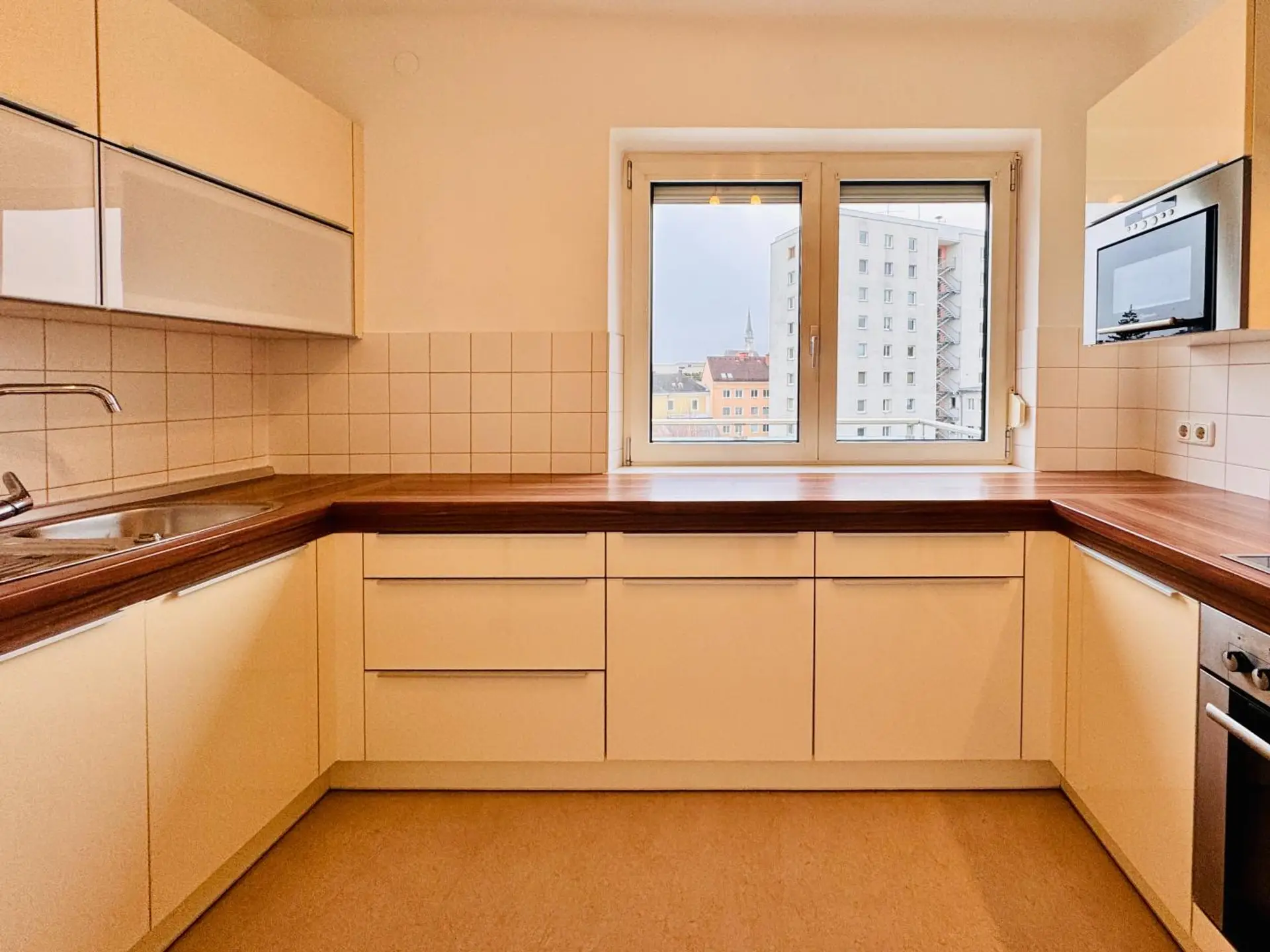 Die Wohnung bietet einen Vorraum, ein Esszimmer mit südwestseitig ausgerichtetem Sonnenbalkon und eine Küche mit viel Arbeitsfläche und funktionstüchtigen Geräten.