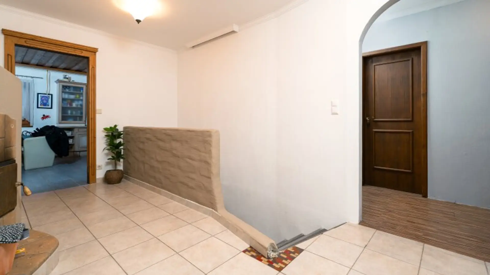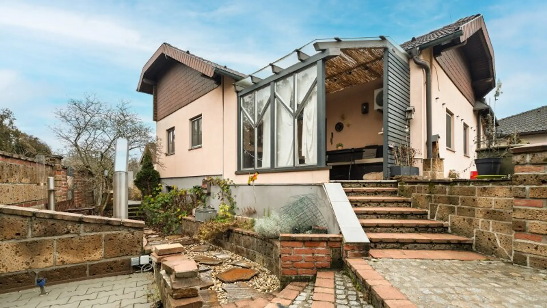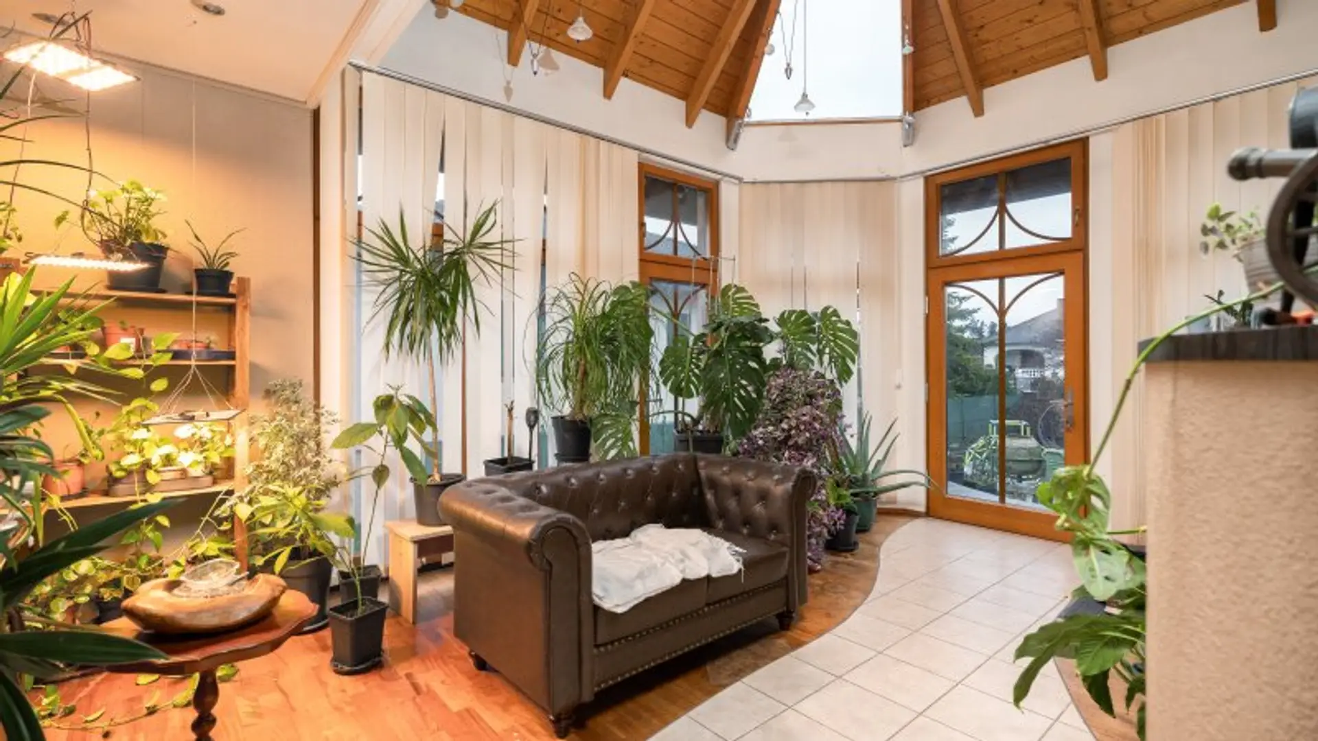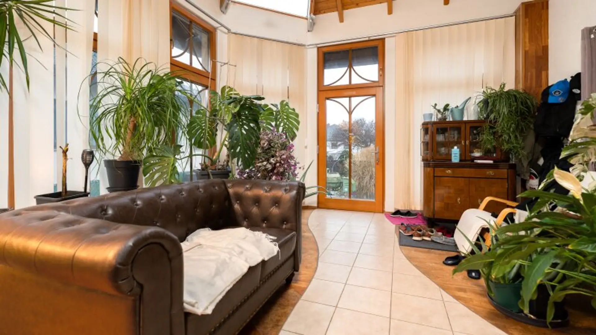 Ein besonderes Highlight ist der wunderschöne Eingangsbereich in Form eines Wintergartens, ausgestattet mit einem Kachelofen, der bereits beim Betreten eine äußerst angenehme Atmosphäre schafft. Über wenige Stufen gelangt man in den zentralen Vorraum, von dem aus alle Räume, der Keller sowie der offene Wohn-Essbereich erschlossen werden.