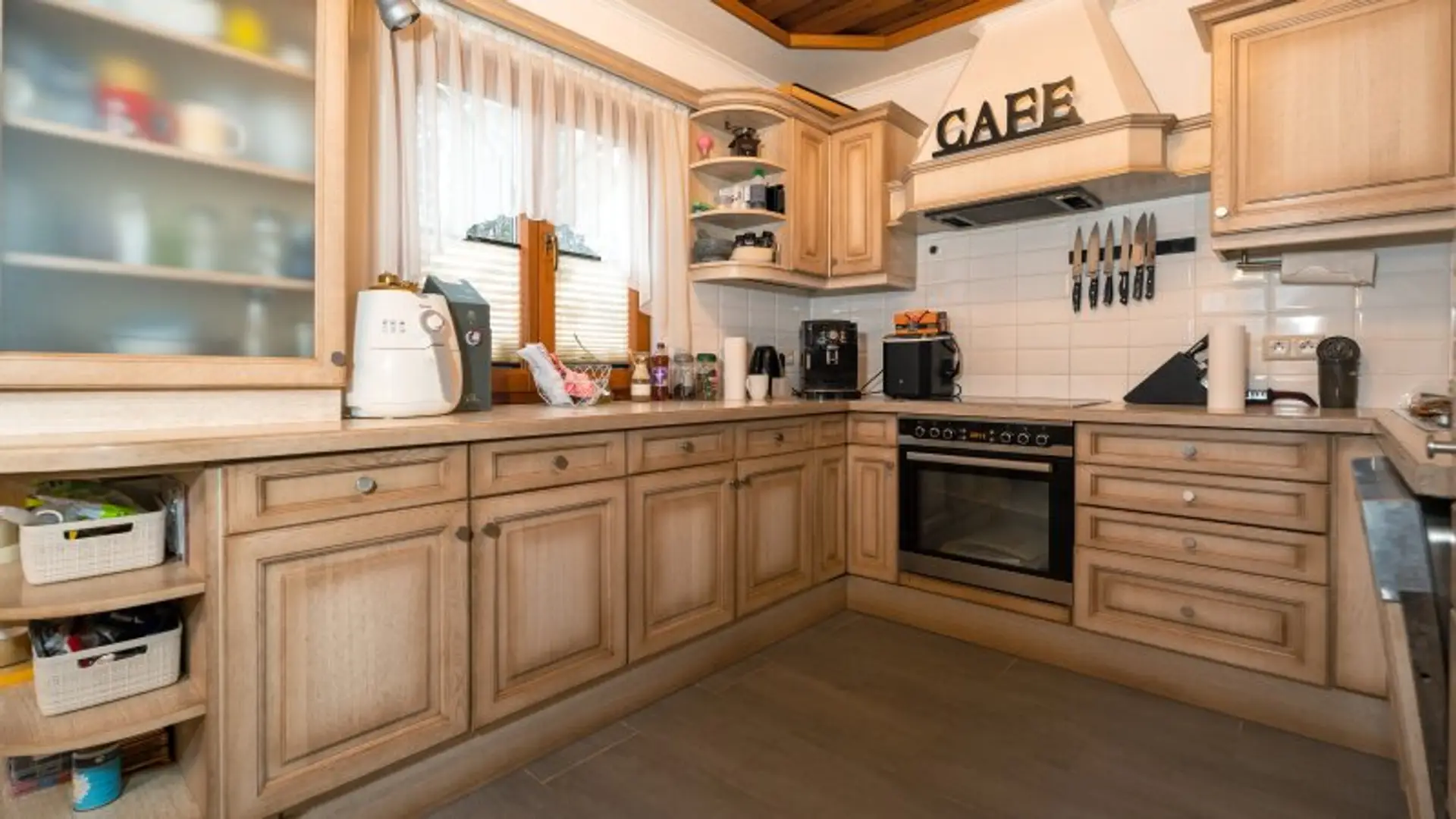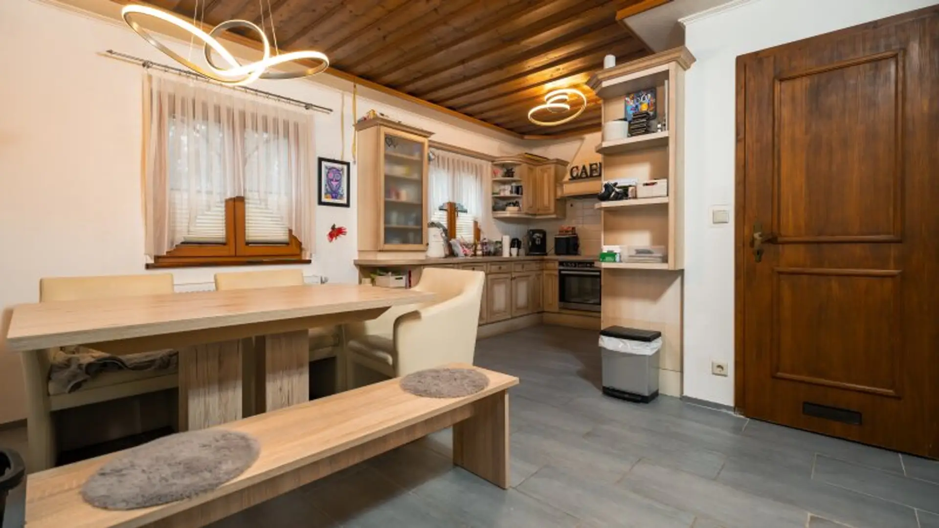 Der helle Wohn-Essbereich mit direktem Ausgang auf die Terrasse bildet das Herzstück des Hauses. Ein Kachelofen sorgt für wohlige Wärme, ein Abstellraum im Küchenbereich bietet zusätzlichen Stauraum.
