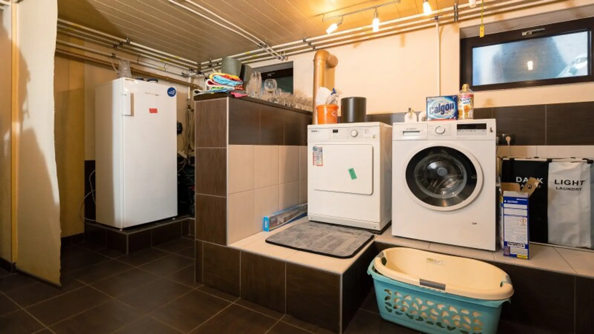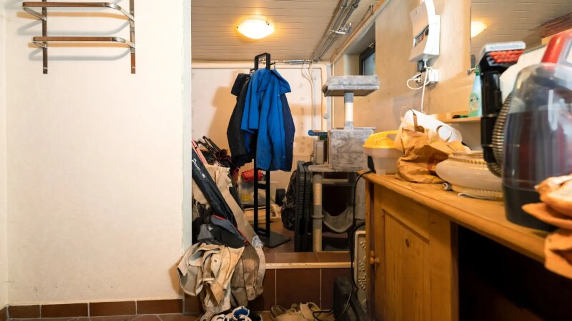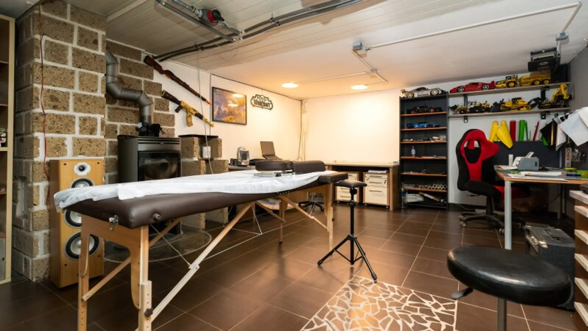 Im Keller befinden sich außerdem ein Kellergang, ein kleiner Raum, ein WC, ein Hauswirtschaftsraum mit Dusche sowie ein großzügiger Studioraum mit Festbrennstoffofen.
