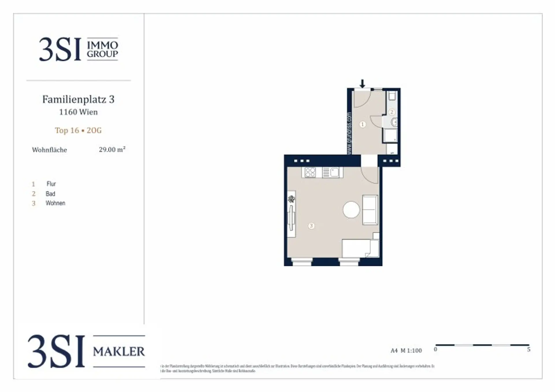 Diese teilmöblierte 1 Zimmer-Wohnung befindet sich im 2. Obergeschoß, verfügt über eine Wohnfläche von ca. 29m² und teilt sich wie folgt auf: