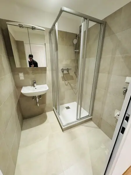 Die Wohnung besteht aus einem Vorzimmer mit viel Platz für eine große Garderobe, einem separatem WC, einem Badezimmer mit Dusche, einem Abstellraum mit eingebautem Kasten sowie einem Zimmer mit voll ausgestatter Küche mit Kühlschrank, Herd, Backrohr und Dunstabzug.
