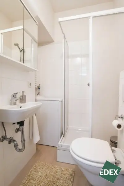 Badezimmer mit Dusche, WC, Waschbecken und Waschmaschinenanschluss