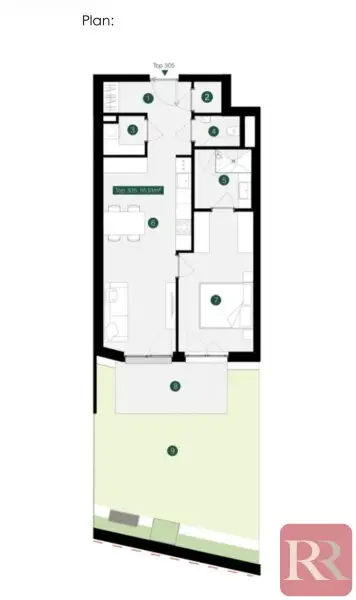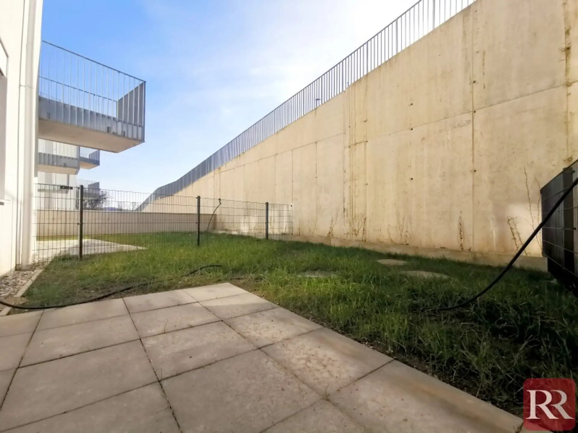 Die Wohnung verfügt über eine Wohnküche, ein weiteres Zimmer, ein Badezimmer mit Dusche, einen Abstellraum mit Waschmaschinenanschluss, ein WC sowie einen Garten (40 m²), der über das Wohnzimmer erreicht wird.
