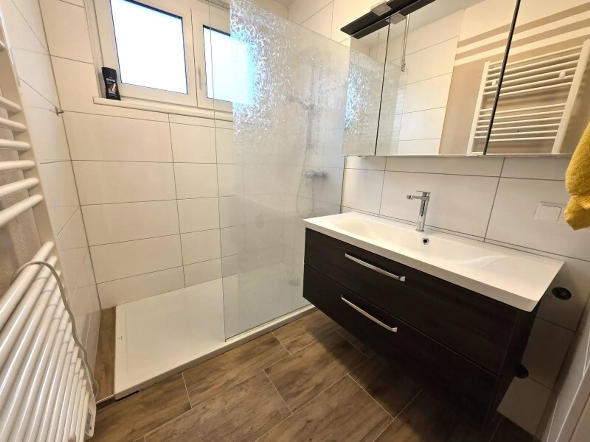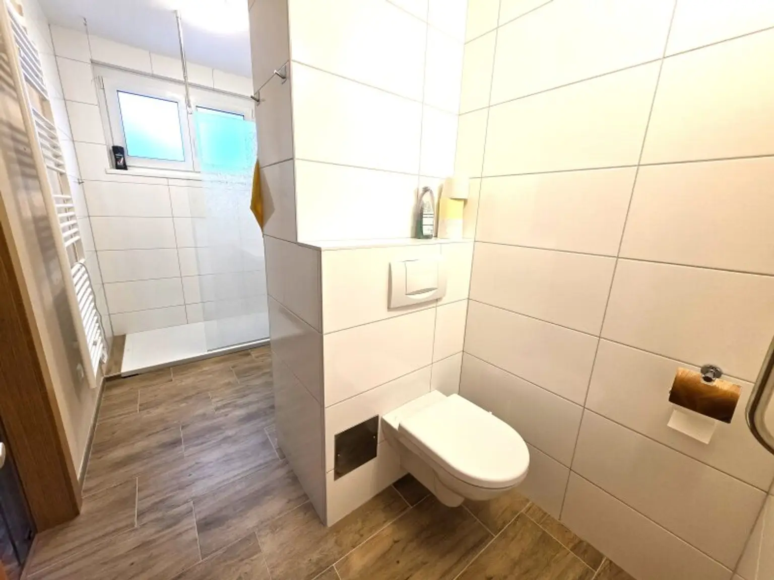 Ein besonderes Highlight ist das praktisch gestaltete Badezimmer, das sowohl vom Vorraum als auch direkt vom Schlafzimmer über eine Schiebetür zugänglich ist. Diese durchdachte Lösung sorgt für zusätzlichen Komfort und Privatsphäre.
