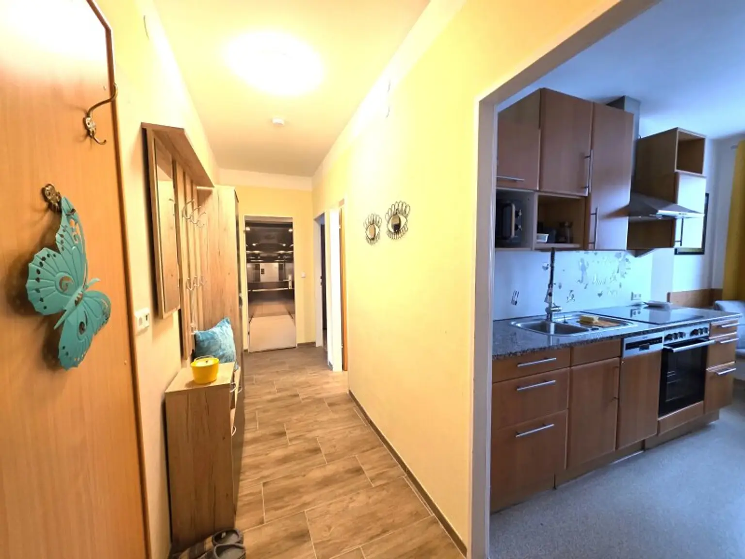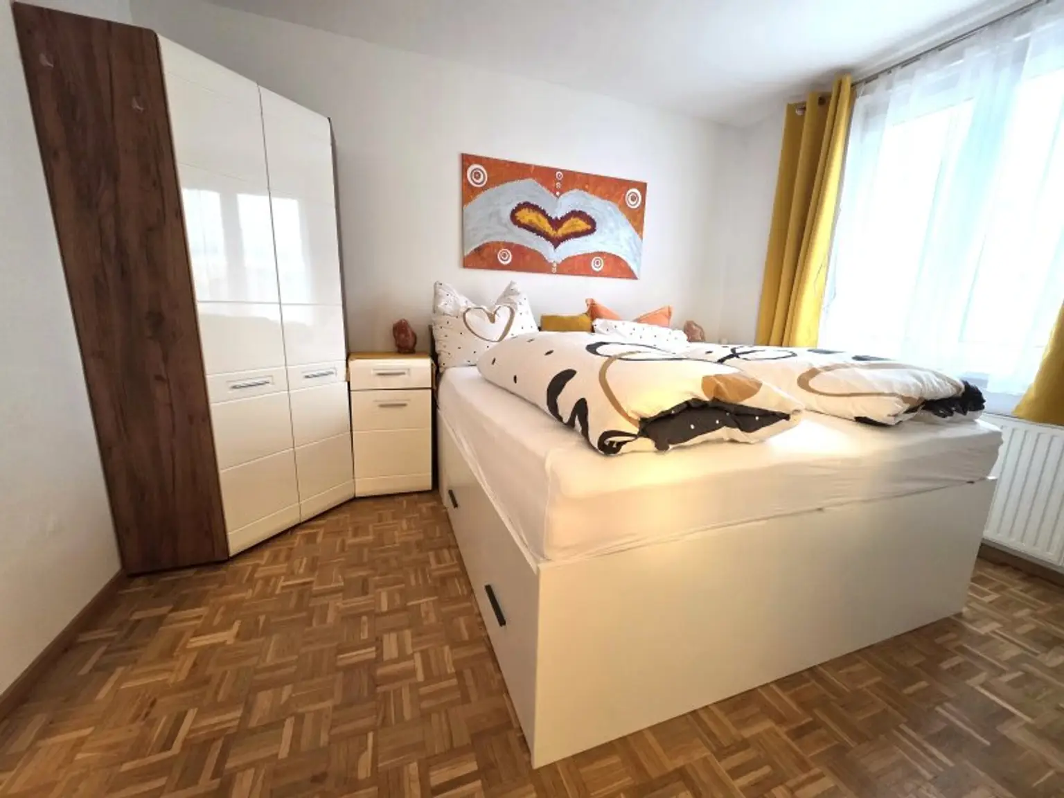 Der Wohnbereich präsentiert sich hell und einladend und ist bereits möbliert. Auch die Küche ist ausgestattet und bietet alles, was man für den Alltag benötigt. Das Schlafzimmer überzeugt durch seine angenehme Größe und ist ebenfalls möbliert – perfekt zum Ankommen ohne großen Aufwand.