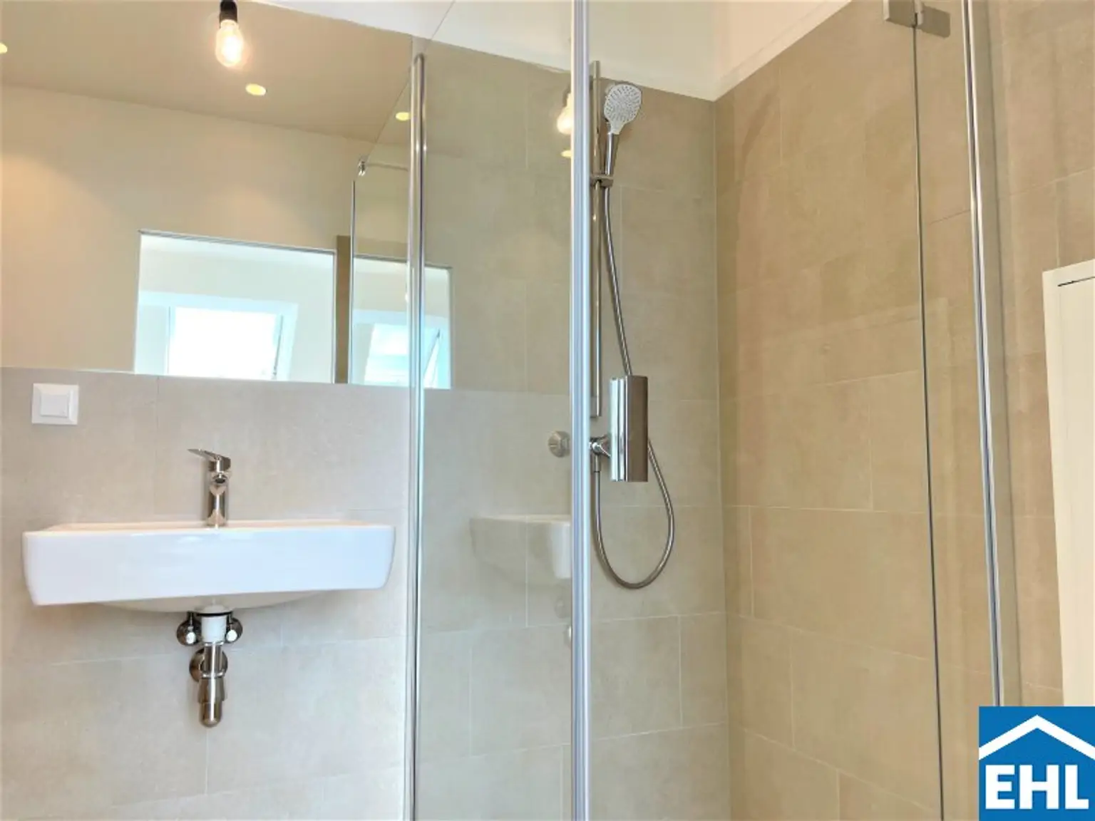 * Badezimmer mit Dusche, WC und Waschmaschinenanschluss.