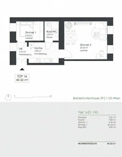 Mit einer Wohnfläche von ca. 40 m², verteilt auf 2 Zimmer, richtet sich die Wohnung in den ruhigen, begrünten Innenhof hinter dem Gebäude. Die hohen Fenster der Wohnküche sorgen für viel Tageslicht und schaffen eine angenehme Atmosphäre, ohne dass sich die Räume im Sommer stark aufheizen.