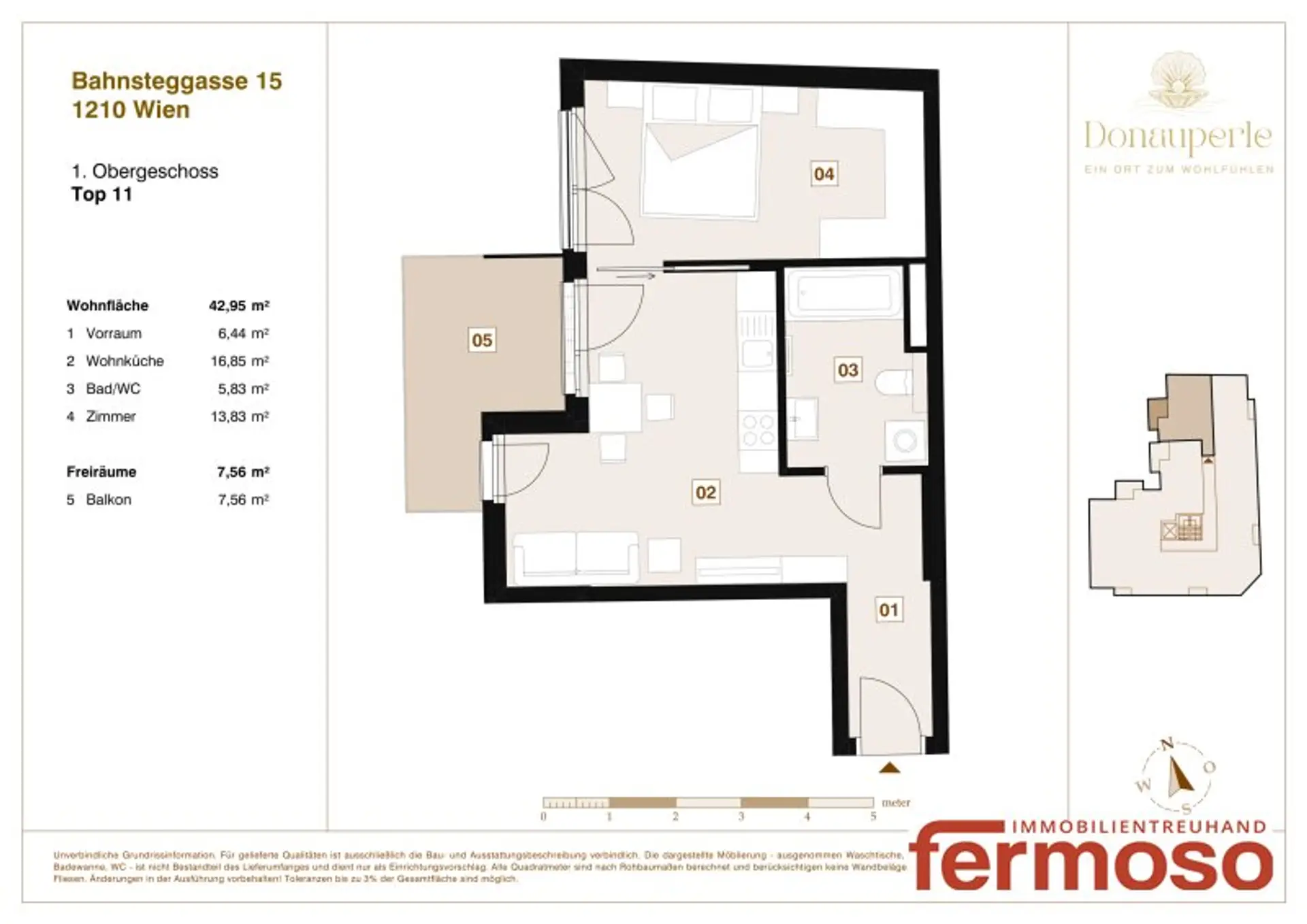 In der modernen Donau Perle in der Bahnsteggasse 15 erwartet Sie diese perfekt geschnittene 2-Zimmer-Wohnung mit ca. 42,95 m² Wohnfläche und einem sonnigen Balkon (7,56 m²). Ideal für Singles oder Paare, die modernes Wohnen mit hoher Lebensqualität verbinden möchten.