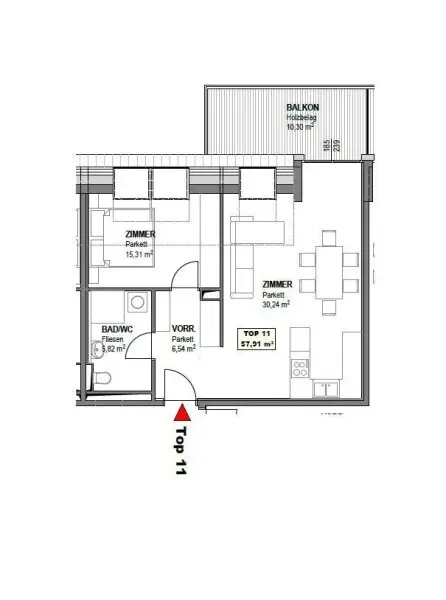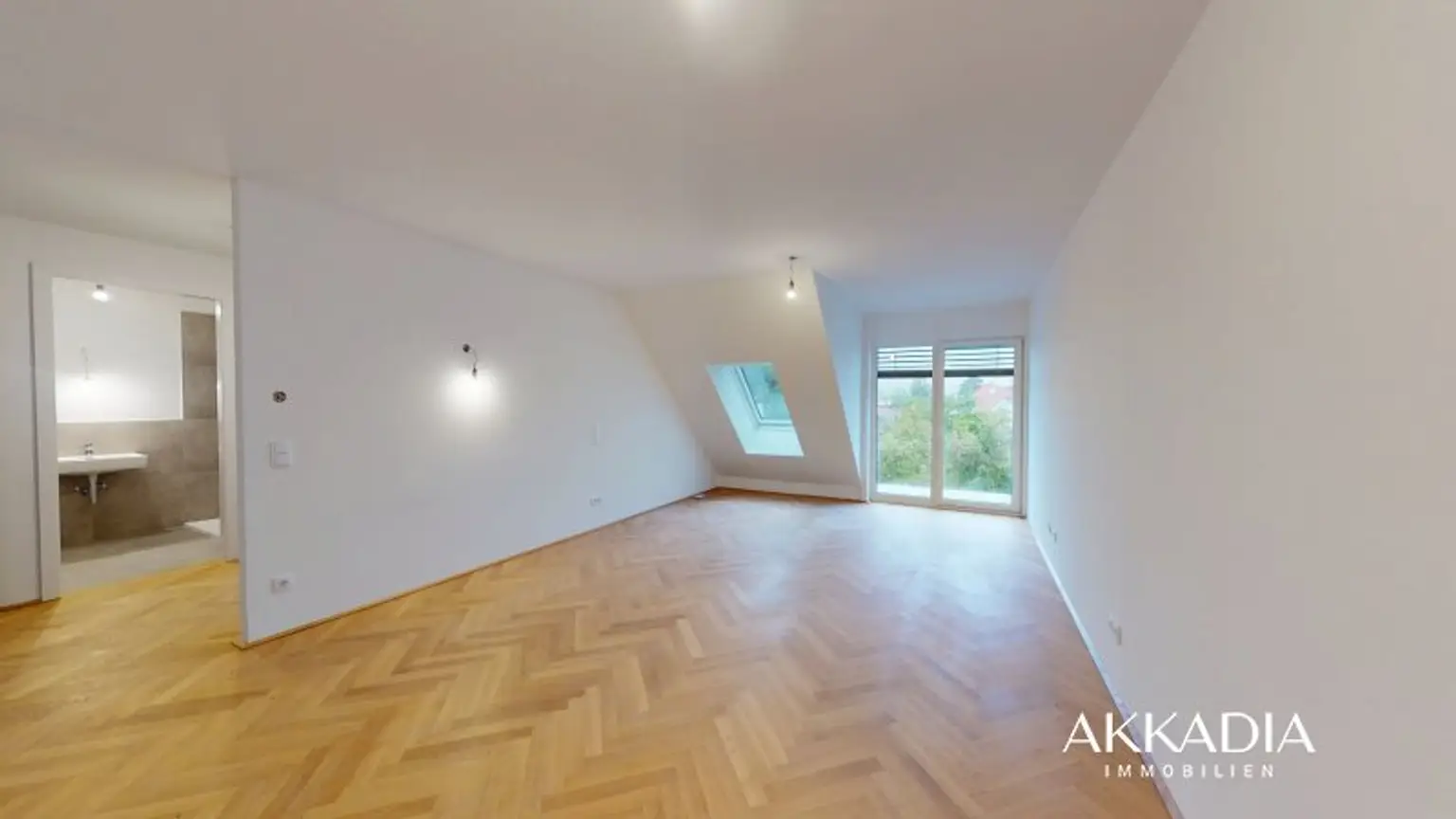 Mit einer Wohnfläche von rund 57 Quadratmetern bietet diese Dachgeschosswohnung ein charmantes Zuhause für Paare oder Alleinstehende. Der Wohnbereich öffnet sich auf einen Balkon von über zehn Quadratmetern, der zusammen mit der kleinen Terrasse eine angenehme Erweiterung ins Freie darstellt. Durch die Lage im Dachgeschoss genießt man hier nicht nur Ruhe, sondern auch einen schönen Ausblick. Die Wohnung kombiniert kompaktes Wohnen mit einer einladenden Atmosphäre und eignet sich ideal als persönlicher Rückzugsort.