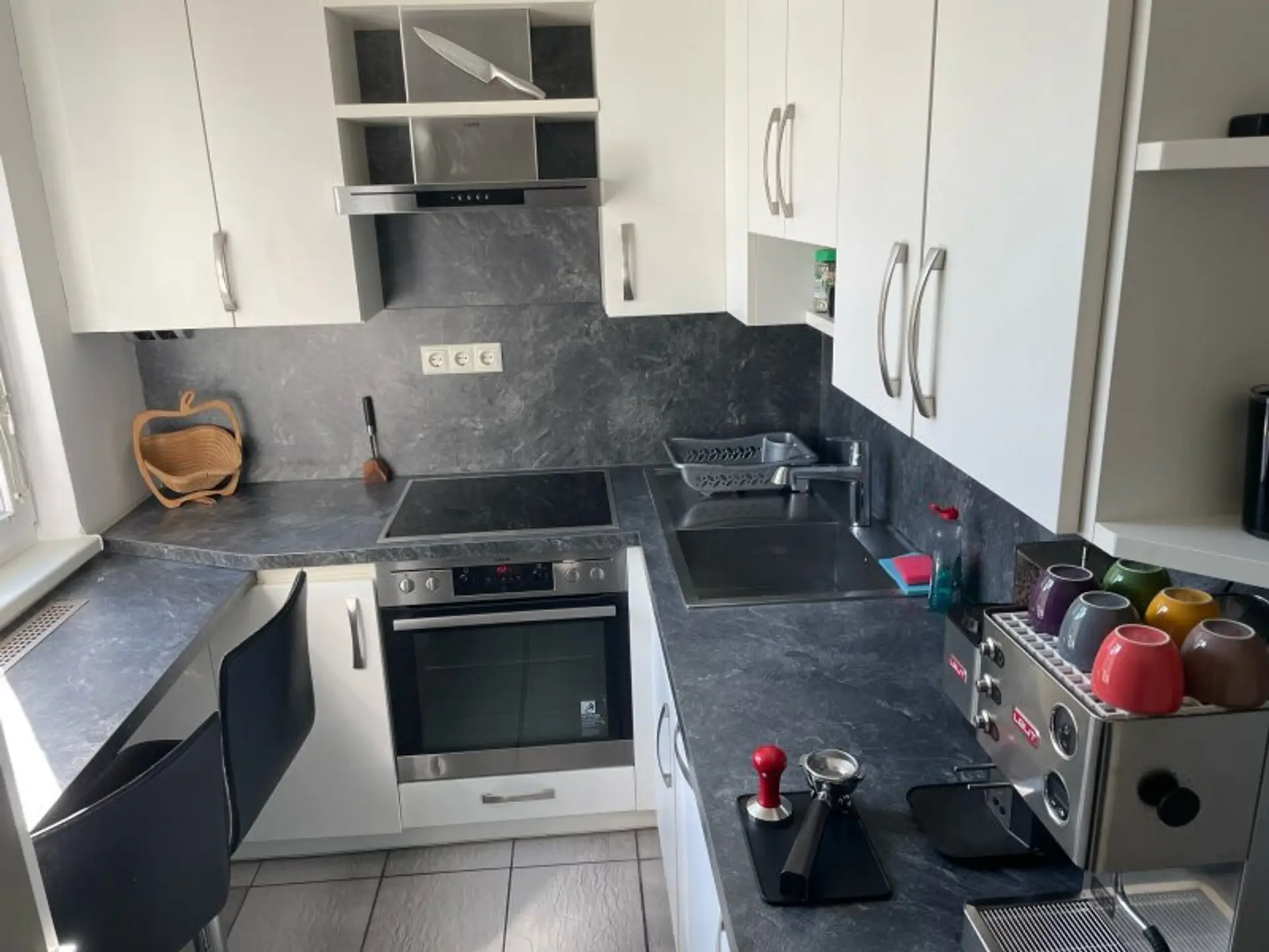 Die Wohnung verfügt über ein Wohn-/Esszimmer mit Zugang zum Balkon mit Blick ins Grüne, wo Sie bei Vogelgezwitscher entspannen können. Vom großzügigen Vorraum aus gelangen Sie in das Schlafzimmer sowie in die separate Küche mit maßgefertigter Einbauküche von Peter Max. Eine Theke mit zwei Hockern bietet den perfekten Platz für einen Frühstückskaffee mit Blick ins Grüne. Das Badezimmer mit Dusche ist ebenfalls mit Möbeln von Peter Max ausgestattet. Die separate, zentral begehbare Toilette rundet das Raumangebot ab. Zudem ist der Wohnung ein ca. 7 m² großes Kellerabteil mit viel Stauraum zugehörig.