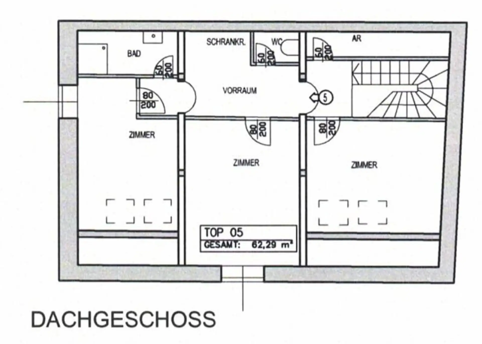 Bei Betreten der Wohnung gelangen Sie in den Vorraum, welcher alle Räume zentral miteinander verbindet. Auf der rechten Seite finden sie das WC, einen Schrankraum und das Badezimmer. Linksseitig liegen die Wohnräume, welche durch Dachfenster mit natürlichem Tageslicht durchflutet werden.