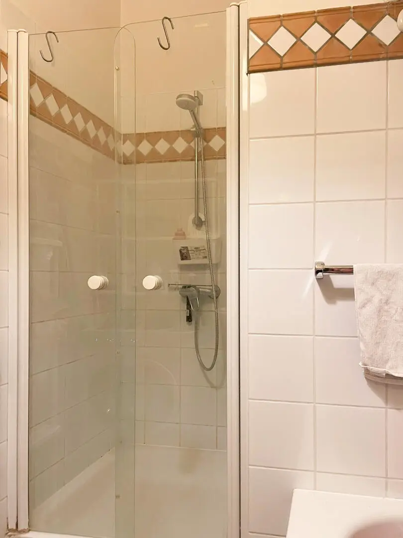 hellen Badezimmer mit Wanne und Dusche. Das Haus selbst präsentiert sich in gutem Erhaltungszustand, typisch für die charmante Gründerzeitarchitektur.
