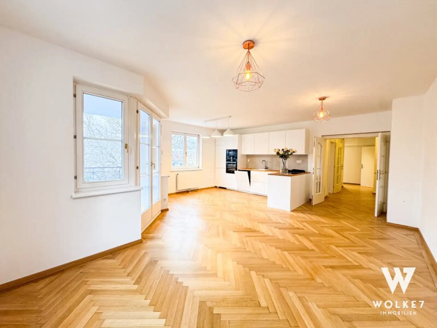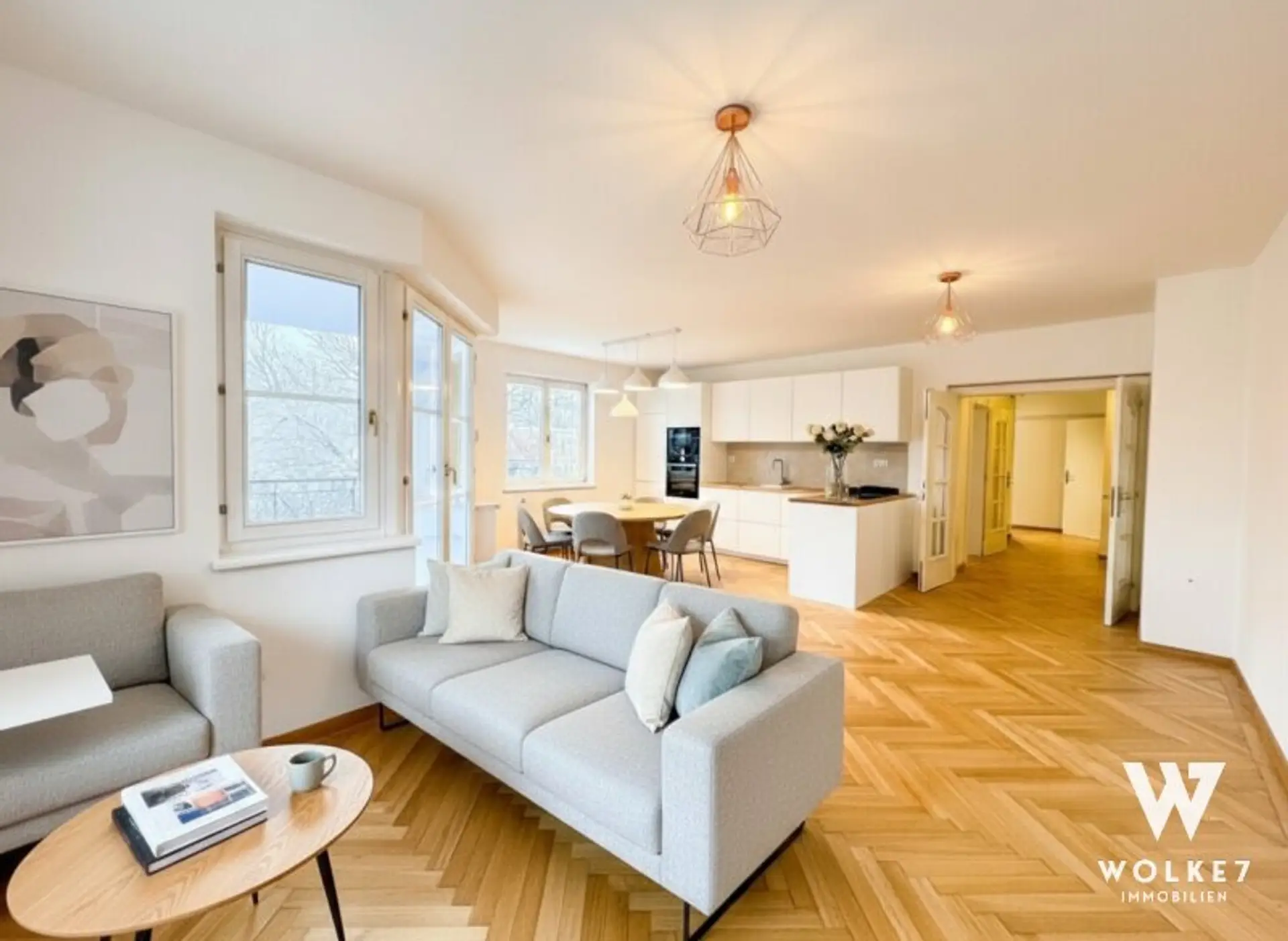 Die ca. 92 m² große Wohnung + ca. 6,8 m² Balkon überzeugt durch einen harmonischen Grundriss, 3 Zimmer, eine Raumhöhe von 2,6 m und eine Ausrichtung in drei Himmelsrichtungen, die für helle und freundliche Räume sorgt. Sie liegt im 2. Obergeschoß mit Lift, alle Räume sind zentral begehbar und mit elegantem Fischgrätparkett ausgestattet.