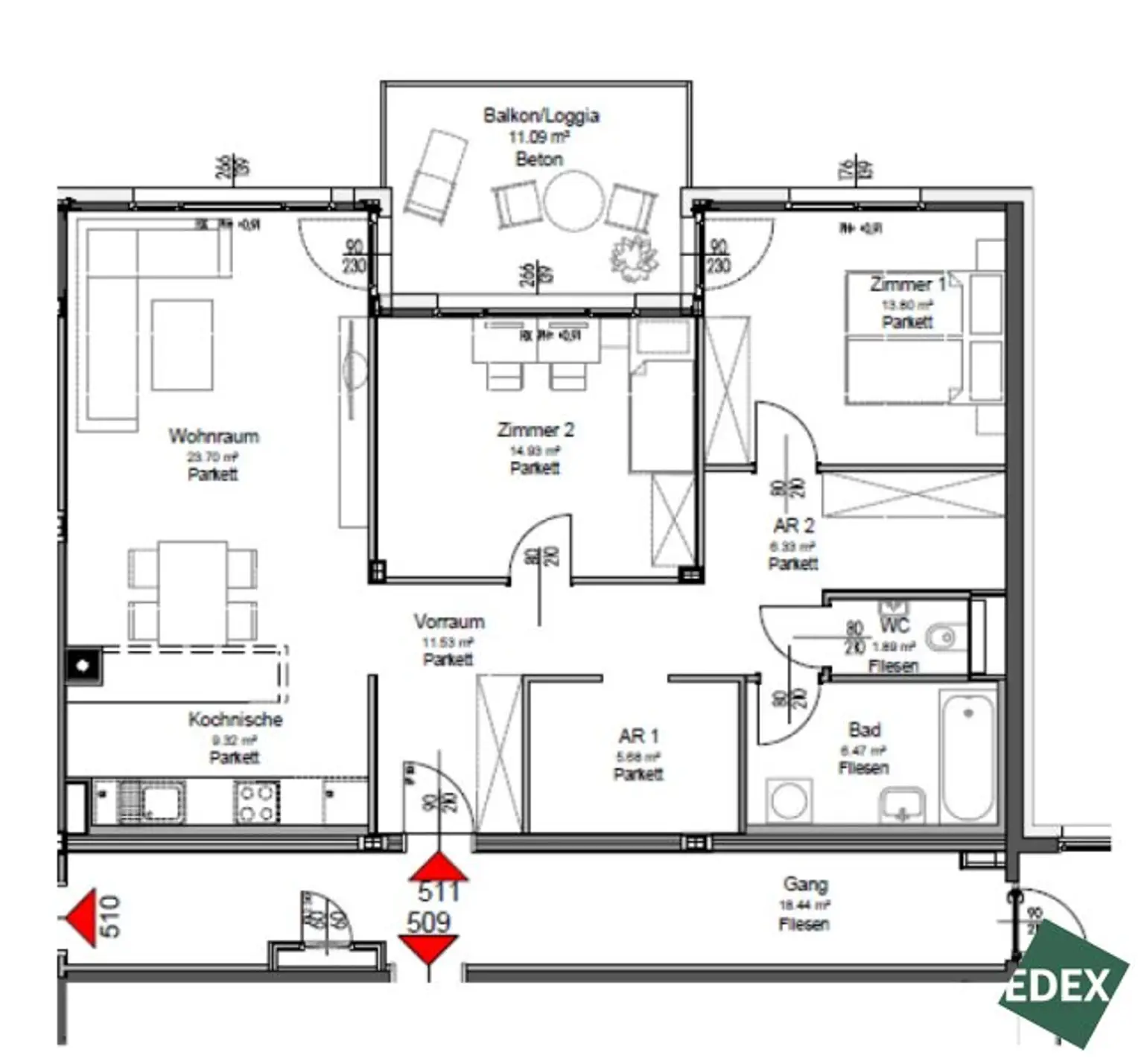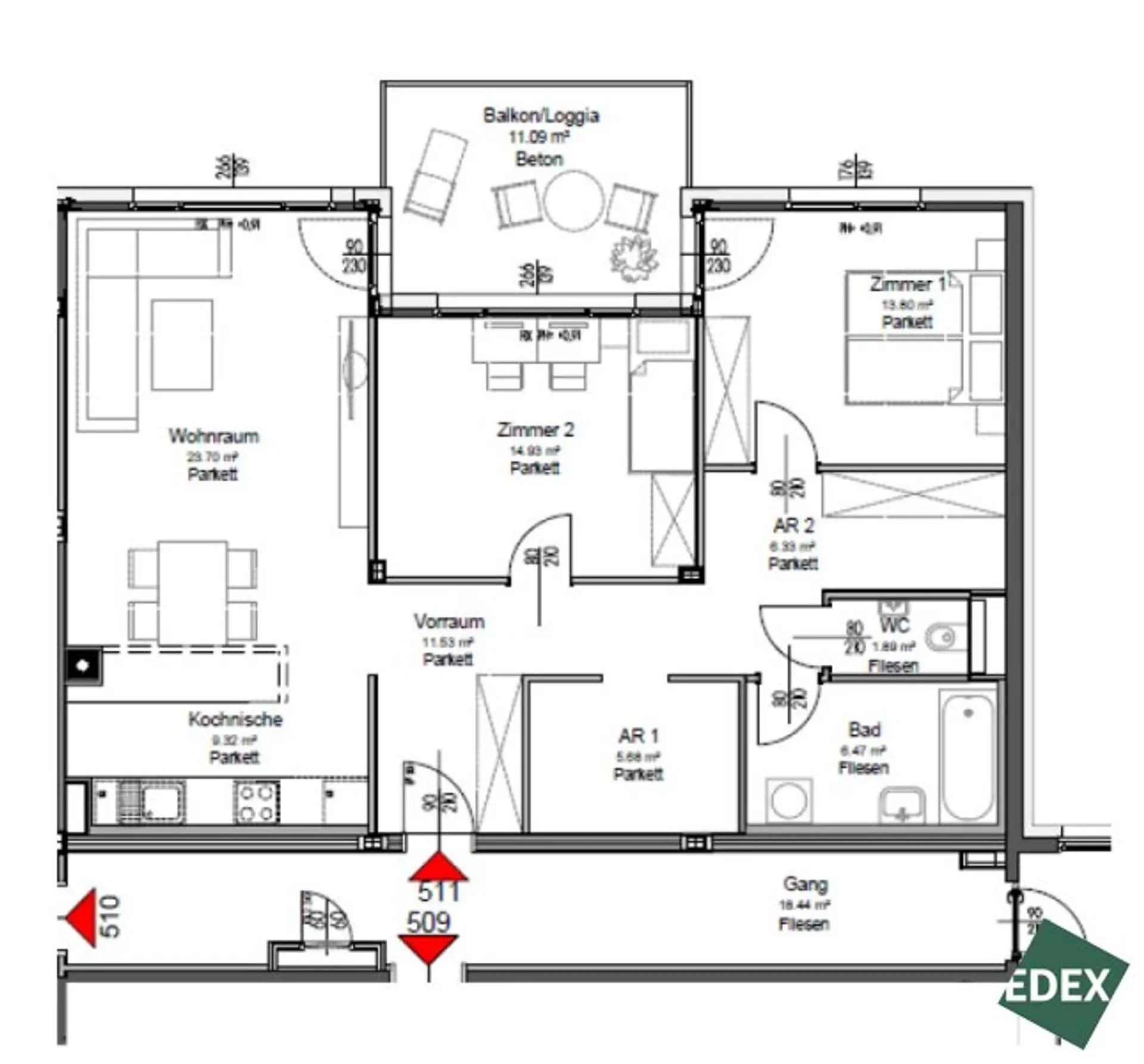 Vom Wohnraum sowie vom zweiten Zimmer aus besteht direkter Zugang zur großzügigen Loggia / zum Balkon mit ca. 11,09 m², der zusätzlichen Freiraum im Außenbereich bietet.