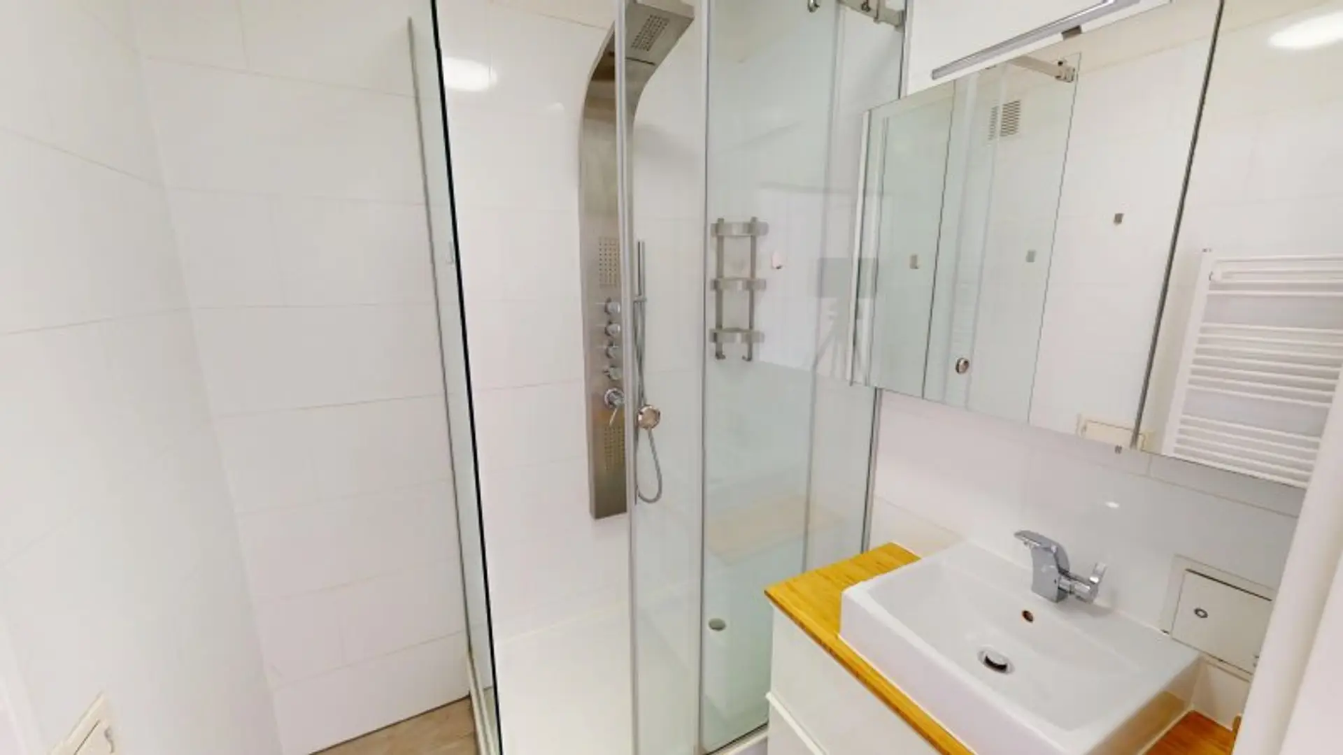 Die separate Küche (ca. 7,55 m²) ist modern ausgestattet und funktional gestaltet. Ergänzt wird das Raumangebot durch ein stilvoll saniertes Badezimmer (ca. 3,3 m²) mit bodengleicher Dusche, ein separates WC (ca. 1,3 m²) sowie einen praktischen Abstellraum (ca. 1,6 m²), der zusätzlichen Stauraum bietet.