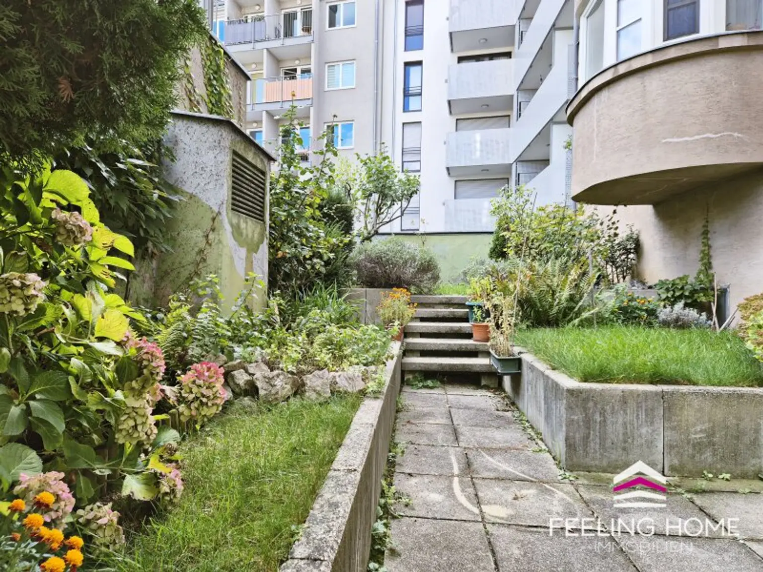 * Liebevoll angelegter, begrünter Innenhof