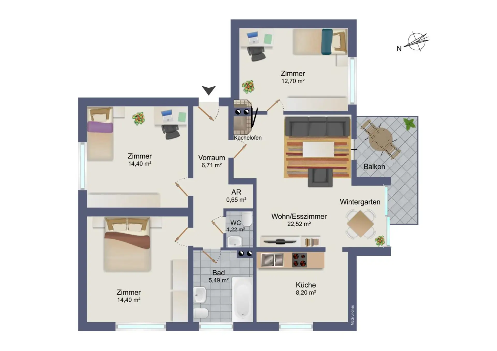 Der Mittelpunkt der Wohnung ist das großzügige Wohn-/Esszimmer mit seinem Zugang zum sonnigen Balkon, der einen idealen Platz für erholsame Stunden im Freien bietet. Ein besonderes Highlight ist der gemütliche Kachelofen, der nicht nur für angenehme Wärme sorgt, sondern auch ein wohliges Wohnambiente schafft. Hier können Sie nach einem langen Tag perfekt entspannen und die Seele baumeln lassen.