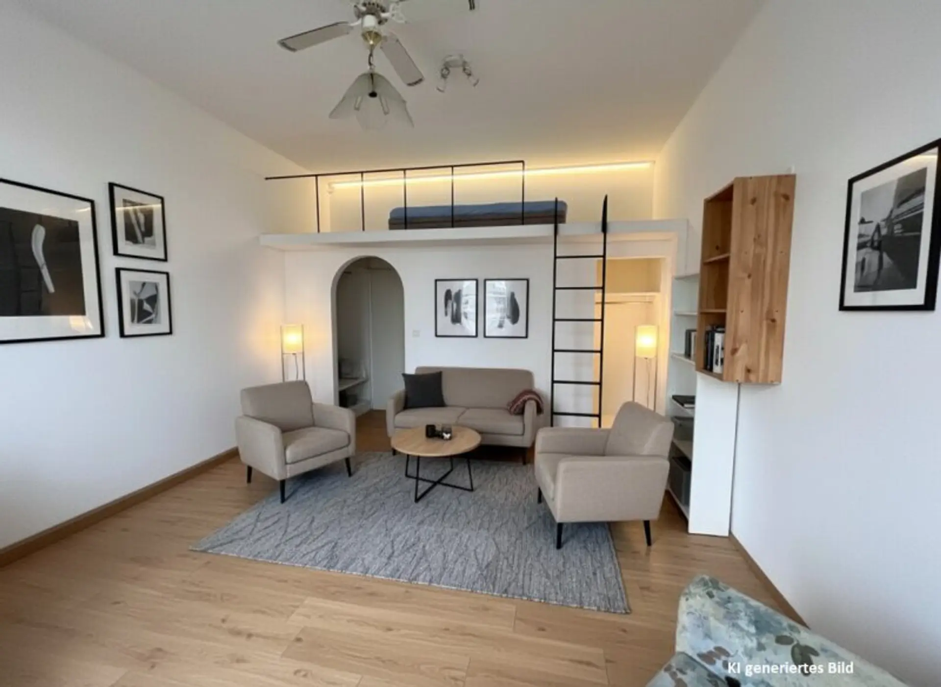 Es wurden mithilfe von KI Ansichten nach einer möglichen Sanierung erstellt. Die Bilder wurden entsprechend gekennzeichnet. Die Bilder des derzeitigen Zustands sind sichtbar und sind die auf den KI generierten Bildern gezeigten Möbel und Zustand derzeit nicht gegeben und auch nicht Teil des Verkaufs.