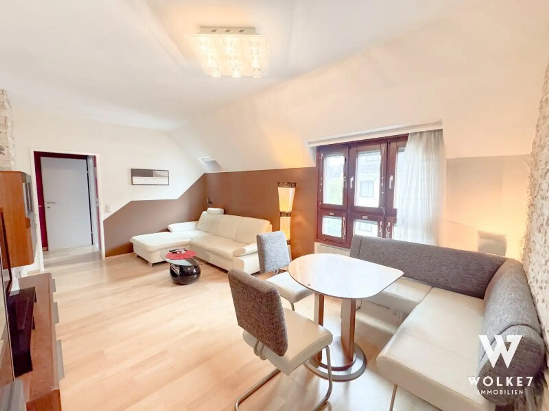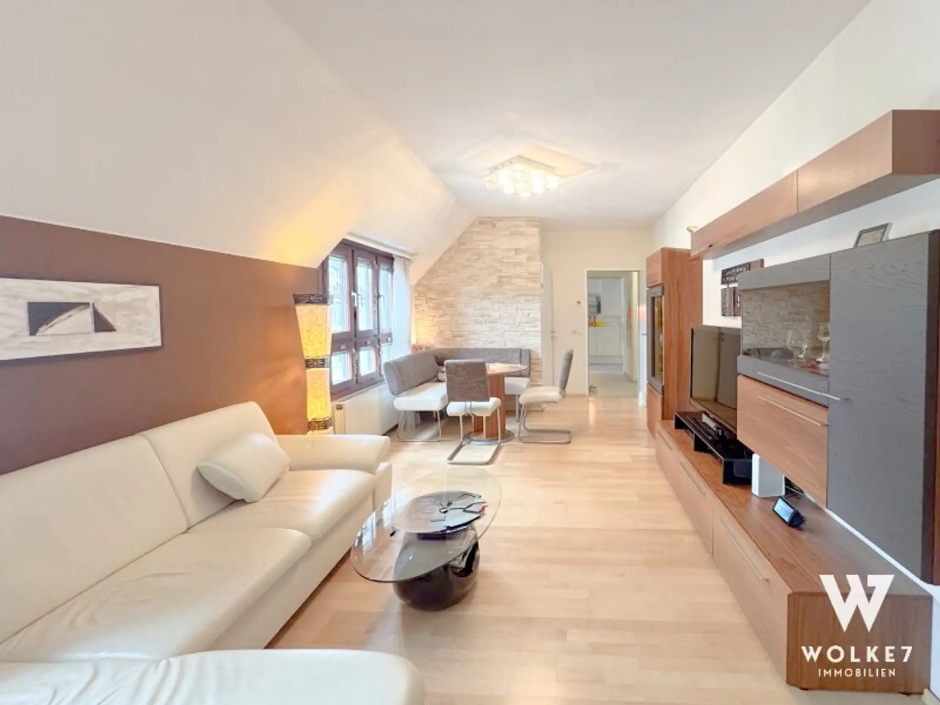 Auf ca. 59,9 m² Wohnfläche bietet die Wohnung ein großzügiges, lichtdurchflutetes Wohnzimmer, ein gemütliches Schlafzimmer mit praktischem Einbauschrank, ein weiteres kleines Zimmer, einen Abstellraum, ein Badezimmer mit Badewanne und Waschmaschinenanschluss sowie ein separates WC. Dank der leichten Dachschrägen und der südseitigen Ausrichtung entsteht eine besonders angenehme Wohnatmosphäre mit viel Tageslicht.