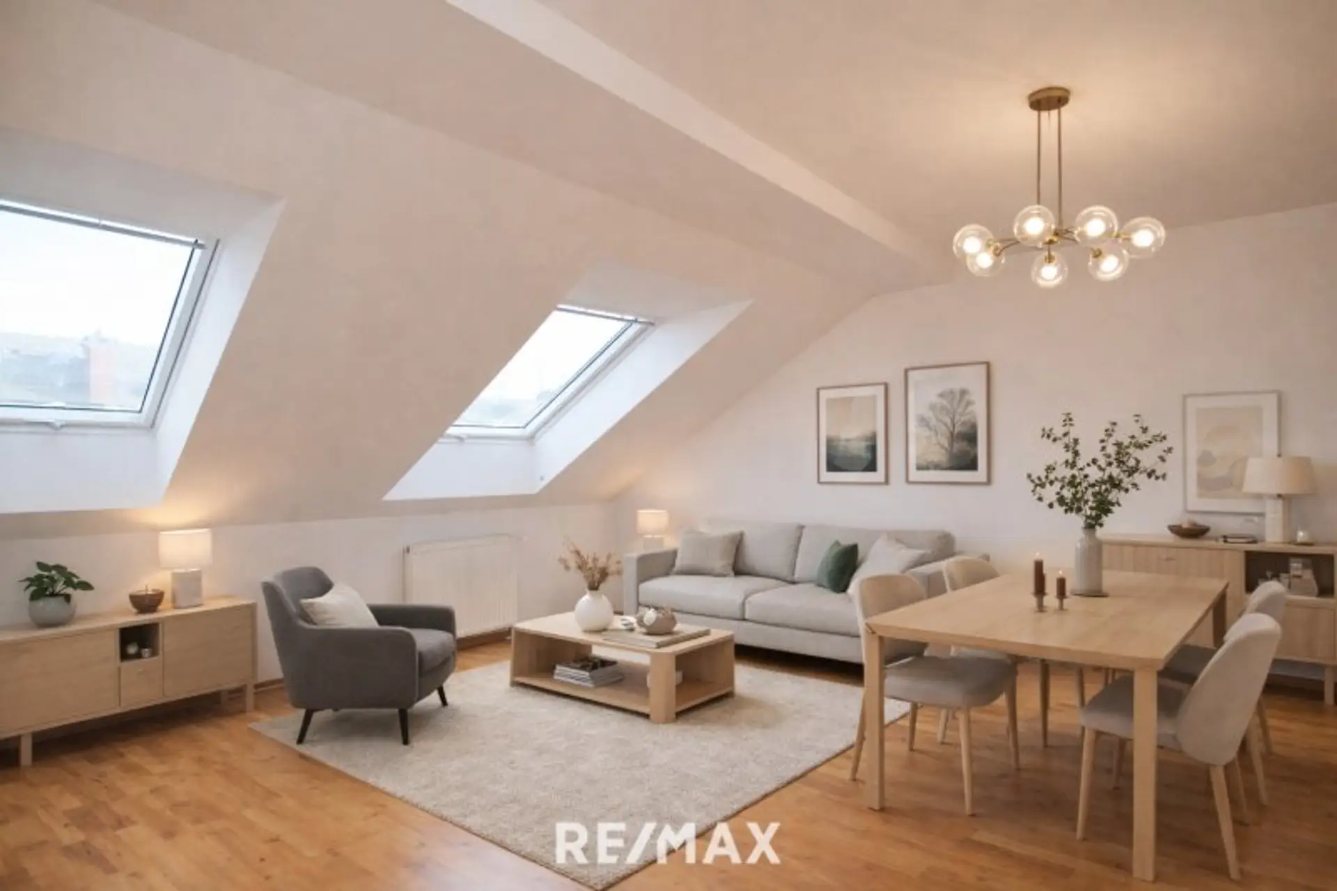 Ein besonderes Highlight ist der zugehörige Balkon, der zusätzlichen Freiraum im eigenen Zuhause schafft und zum Entspannen einlädt. Die großzügigen Velux-Dachflächenfenster mit Sonnenschutz sorgen für helle, freundliche Räume und ein angenehmes Wohnklima.