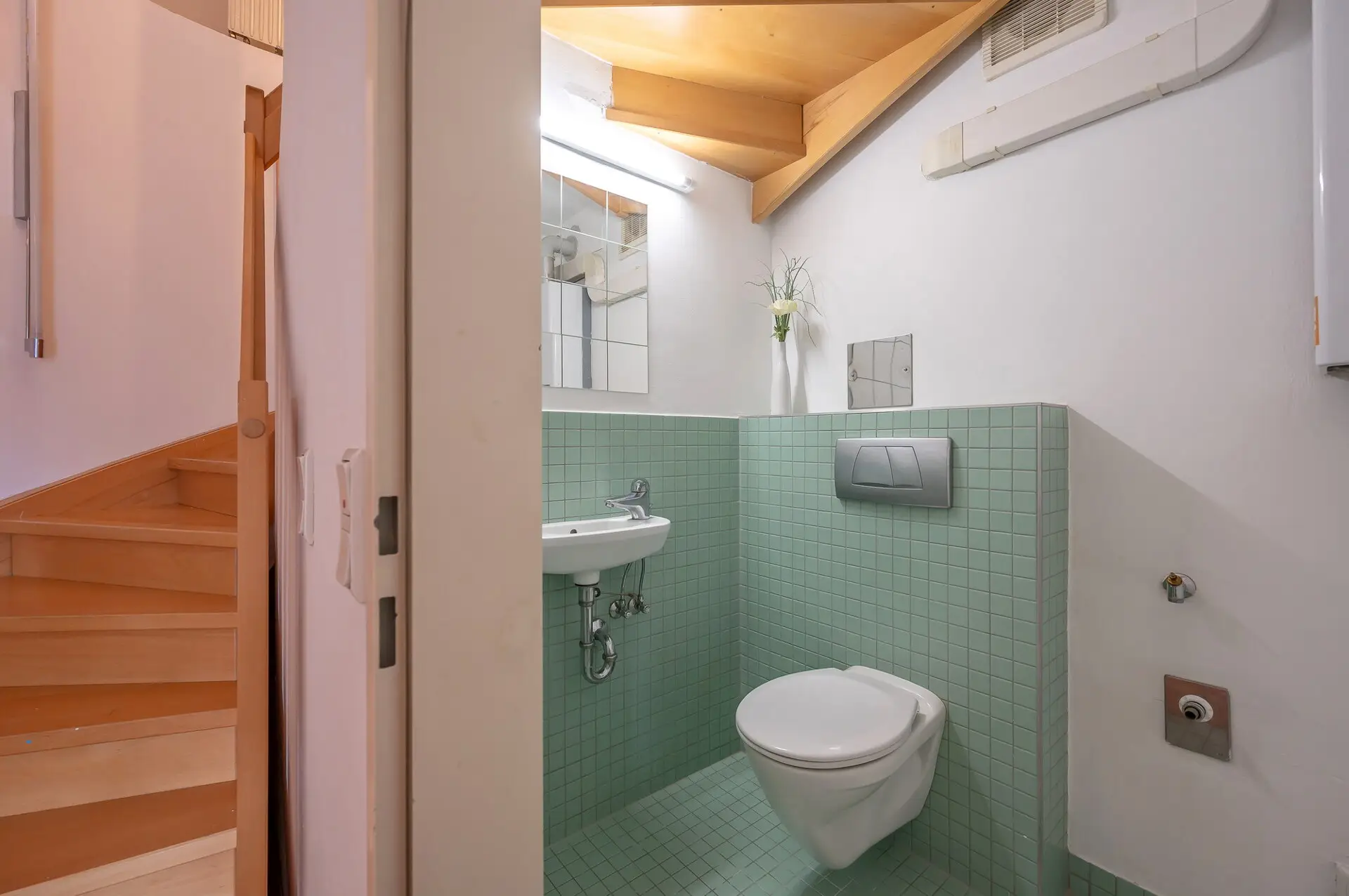 Das großzügige Vorzimmer verfügt über einen Einbau-Schrank mit Ablageflächen und ein zusätzlicher Stauraum befindet sich unterhalb der Treppe. Das Schlafzimmer ist ca. 16m² groß. Die Böden wurden 2025 durch schöne Eichendielen ersetzt und es wurde neu ausgemalt. Eine Toilette mit Handwaschbecken vervollständigt das Untergeschoss.